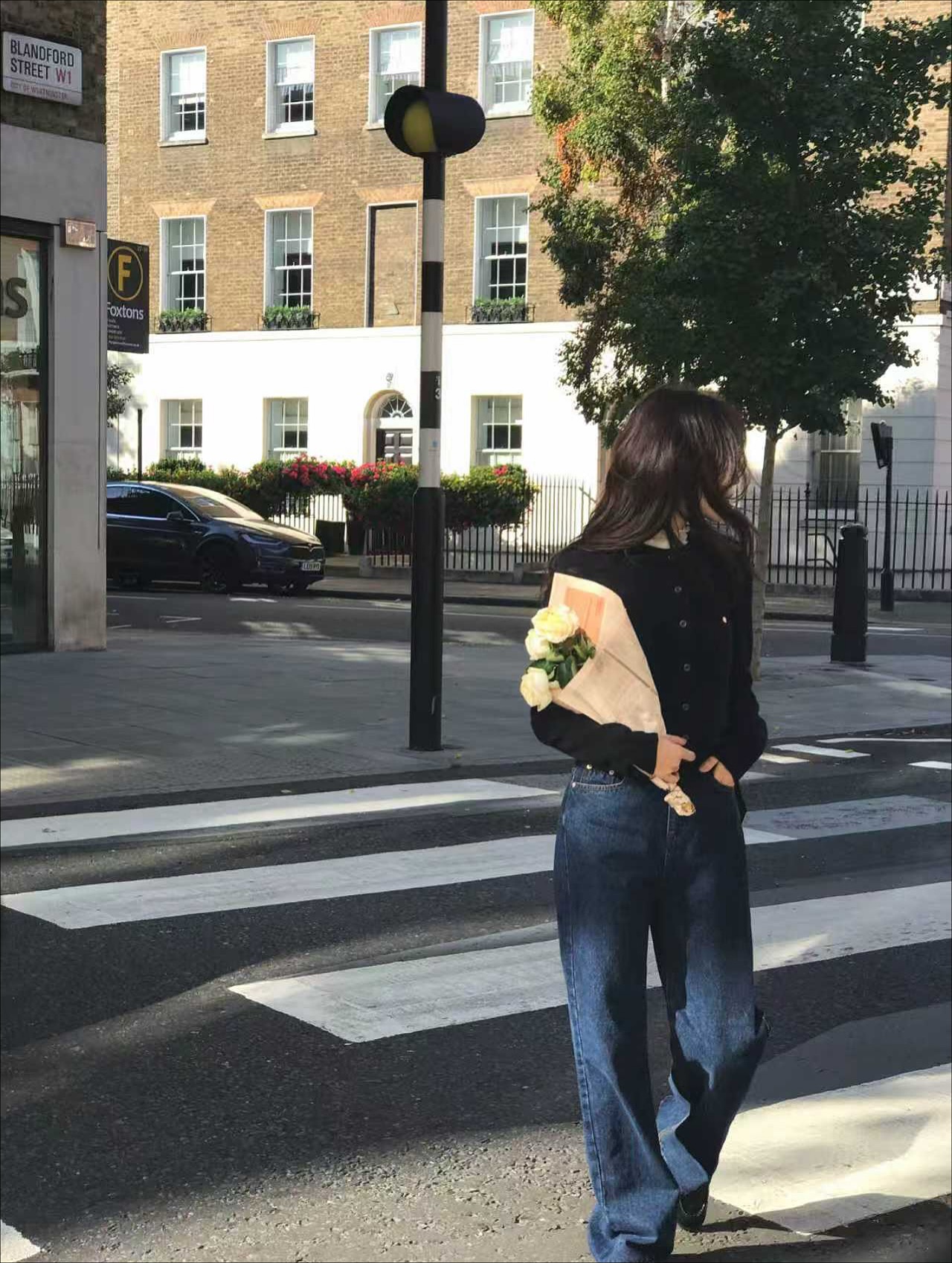 Điểm thú vị là quần jeans ống rộng năm nay quay về với những sắc xanh denim cổ điển, hạn chế wash bạc hay rách gối. Tối giản nhưng lại rất thời thượng, quần jeans ống rộng cho cảm giác phóng khoáng, trẻ trung và cực kỳ dễ phối đồ. Chỉ cần một chiếc áo thun trắng hoặc áo len màu trung tính, bạn đã có ngay set đồ street style đầy năng lượng. Ngoài ra, boots cổ ngắn, sneaker trắng hoặc giày Mary Jane hiện đại đều là lựa chọn hợp để hoàn thiện outfit.