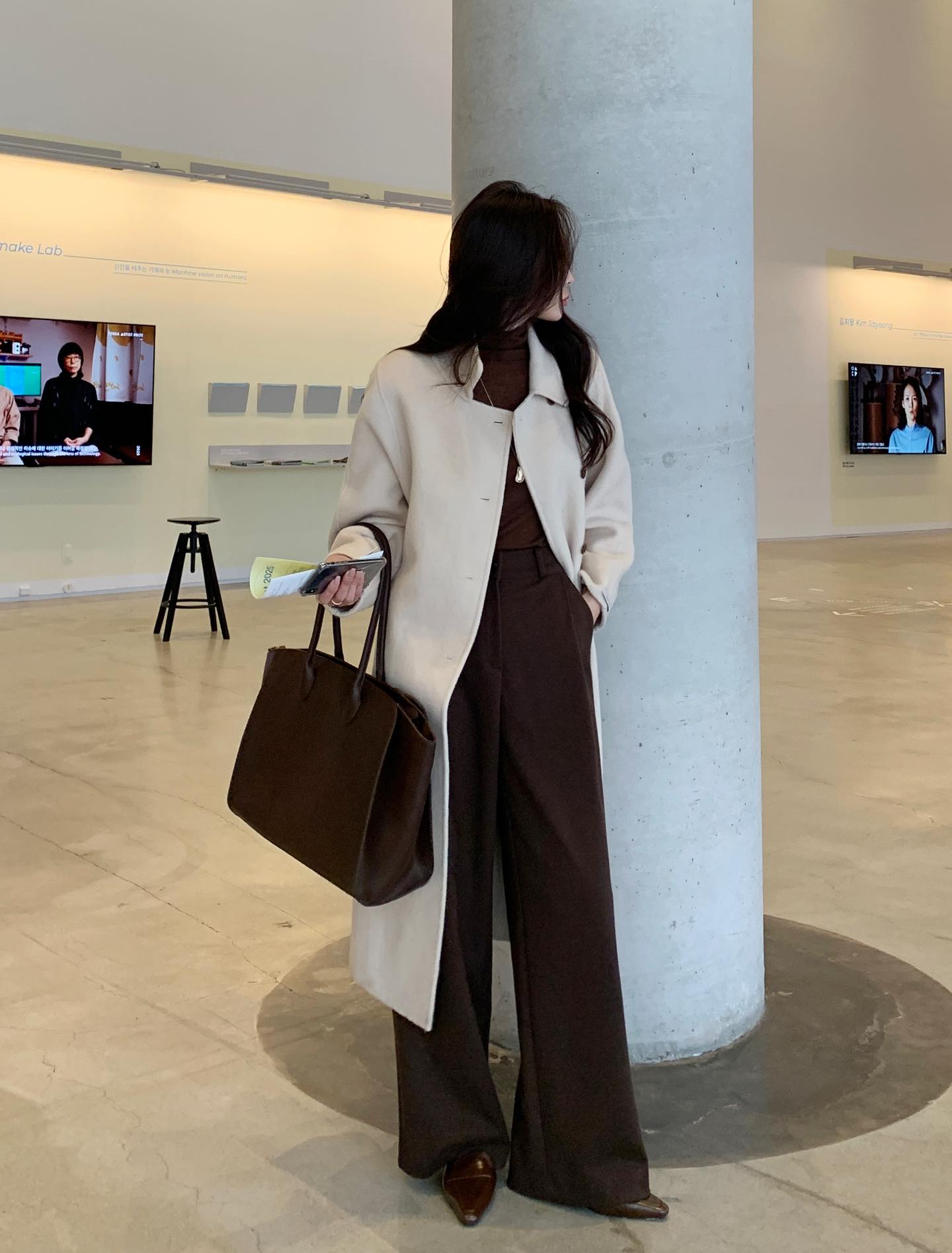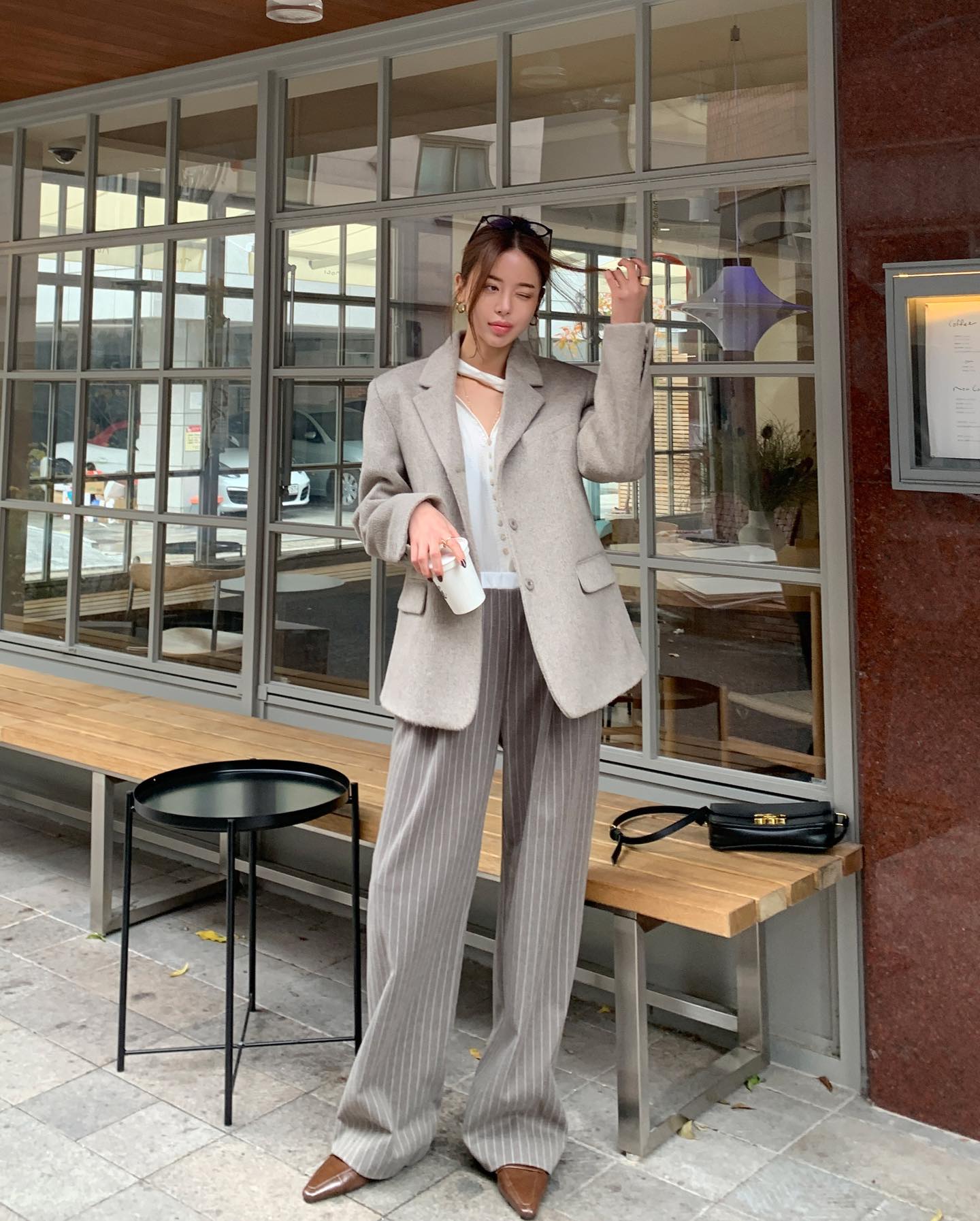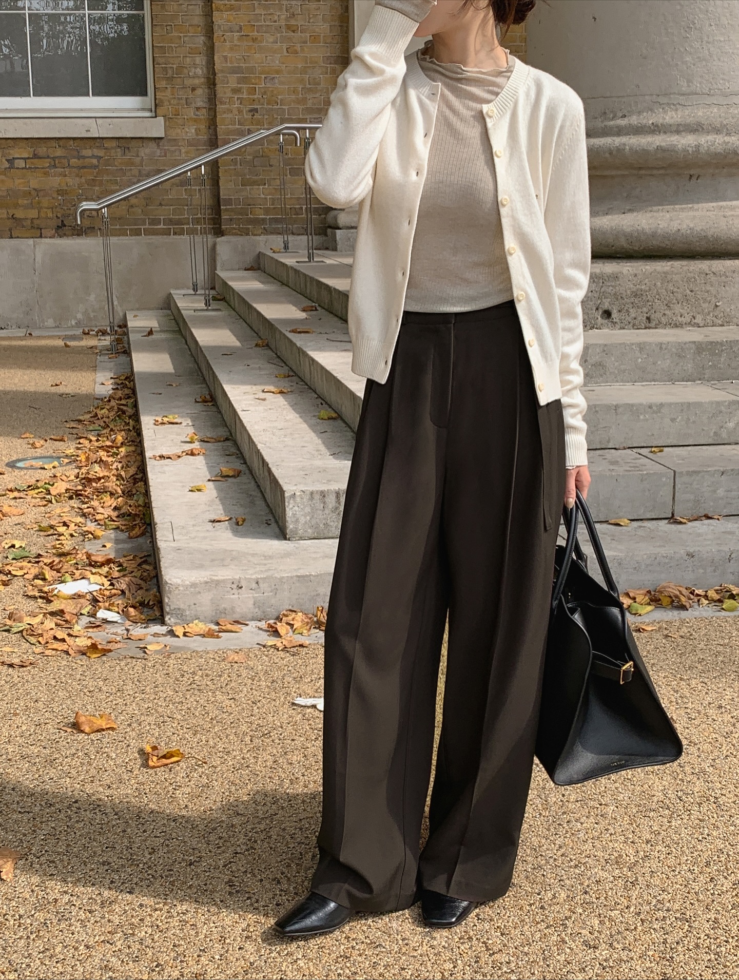 Quần âu ống rộng với đường ly giữa có lẽ là xu hướng thể hiện rõ nhất tinh thần "quiet luxury". Đường ly chạy thẳng từ cạp xuống ống quần tạo cảm giác gọn gàng, tôn chiều cao và giúp tổng thể trang phục trông chỉn chu hơn. Đây là lựa chọn lý tưởng cho dân công sở, đặc biệt khi bạn muốn kết hợp sự thoải mái của quần ống rộng với vẻ thanh lịch đúng chuẩn văn phòng.