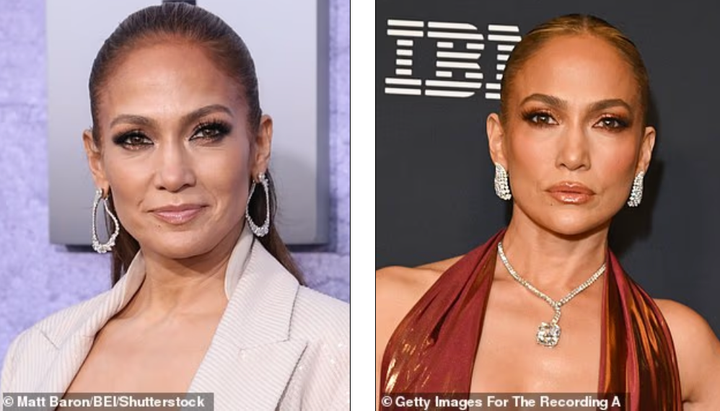 Theo chuyên gia trang điểm của chúng tôi, quá nhiều kem che khuyết điểm có thể đọng lại vào các nếp nhăn nhỏ dưới mắt. Jennifer Lopez tại buổi ra mắt phim The Mother năm 2023 (ảnh trái), nữ ca sĩ tại buổi dạ tiệc tiền Grammy năm 2025 (ảnh phải).