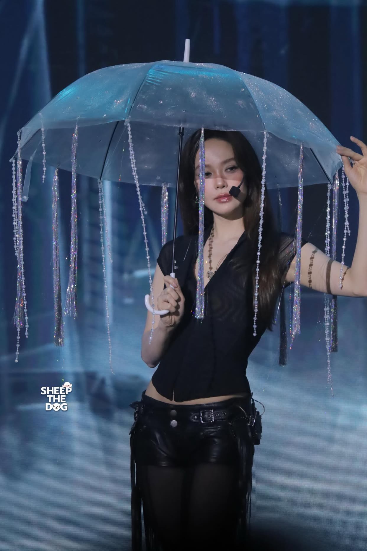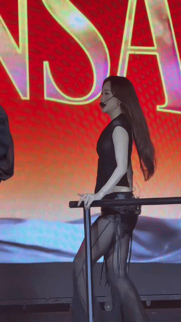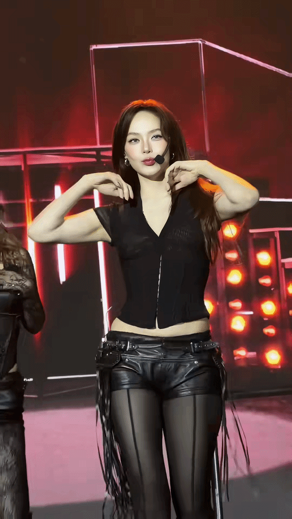 Trong lần lộ diện này, Minh Hằng chọn một set đồ tông đen ôm sát, thiết kế tối giản nhưng tôn trọn vóc dáng. Chiếc áo chất liệu bóng nhẹ kết hợp cùng quần da tạo nên tổng thể vừa cá tính vừa gợi cảm. Điểm nhấn lần này chính là mái tóc được tạo hình đơn giản, chẻ gọn 2 bên và xoã tự nhiên khiến những chuyển động trên sân khấu thêm phần cuốn hút.