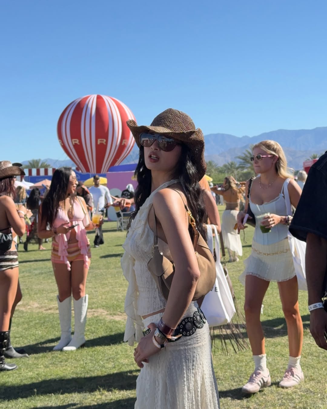Ngoài ra, túi vai nhỏ tông nâu, kính râm bản lớn cùng đồng hồ và vòng tay được phối layer tiết chế giúp hoàn thiện diện mạo theo hướng thời thượng nhưng không quá cầu kỳ. Bảng màu trung tính gồm trắng - be - nâu cũng là lựa chọn thông minh, gợi liên tưởng đến tinh thần sa mạc đặc trưng của các lễ hội âm nhạc kiểu Coachella.