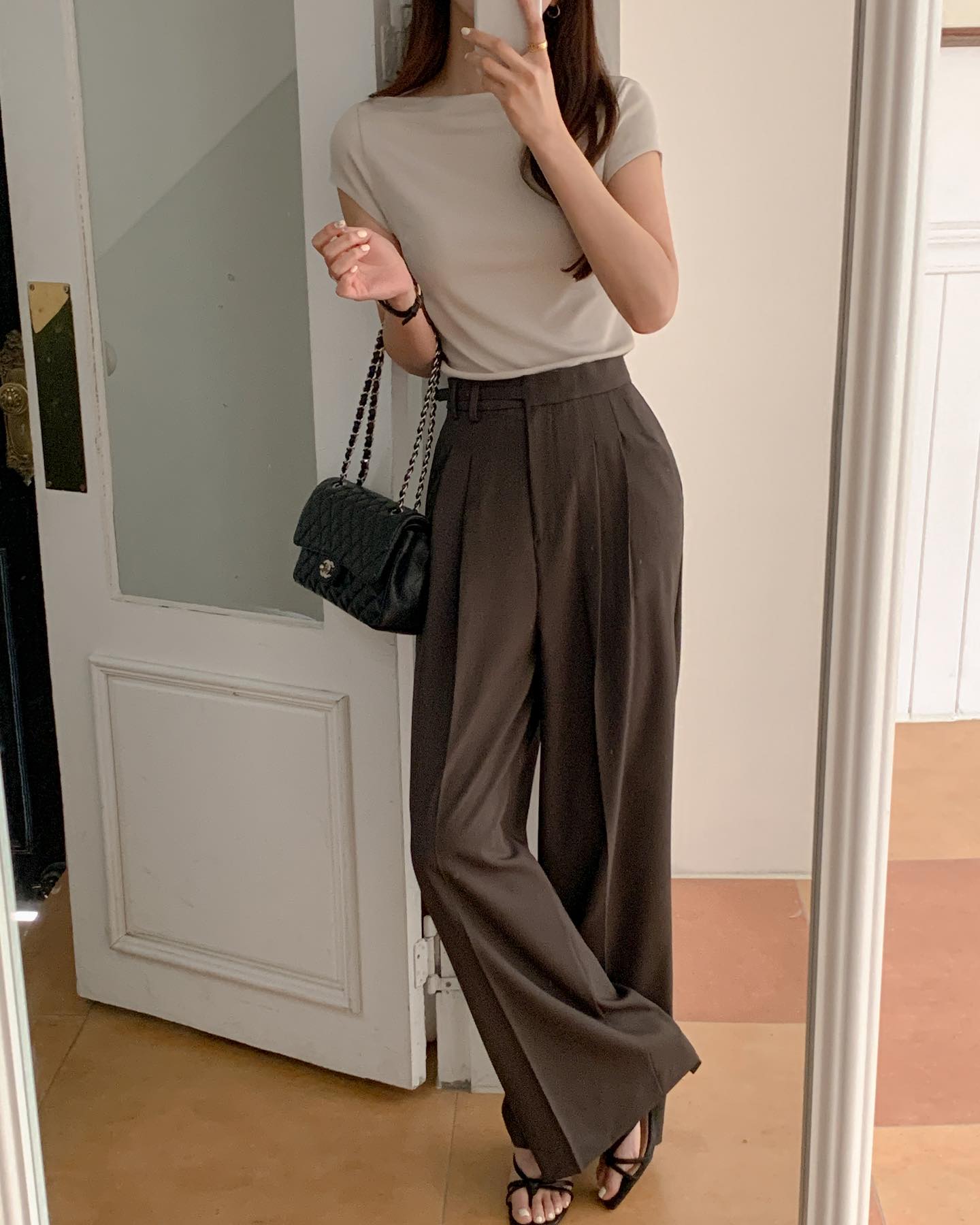 Một chiếc áo thun trắng phối với quần đen ống suông là công thức kinh điển mà hầu như ai cũng có thể mặc đẹp. Nếu muốn set đồ nổi bật hơn, bạn có thể chọn áo thun có họa tiết nhỏ hoặc logo tối giản. Thêm một đôi sneaker hoặc sandal da là đủ để tạo nên một outfit năng động, phù hợp cho những buổi đi dạo, cà phê hay mua sắm.