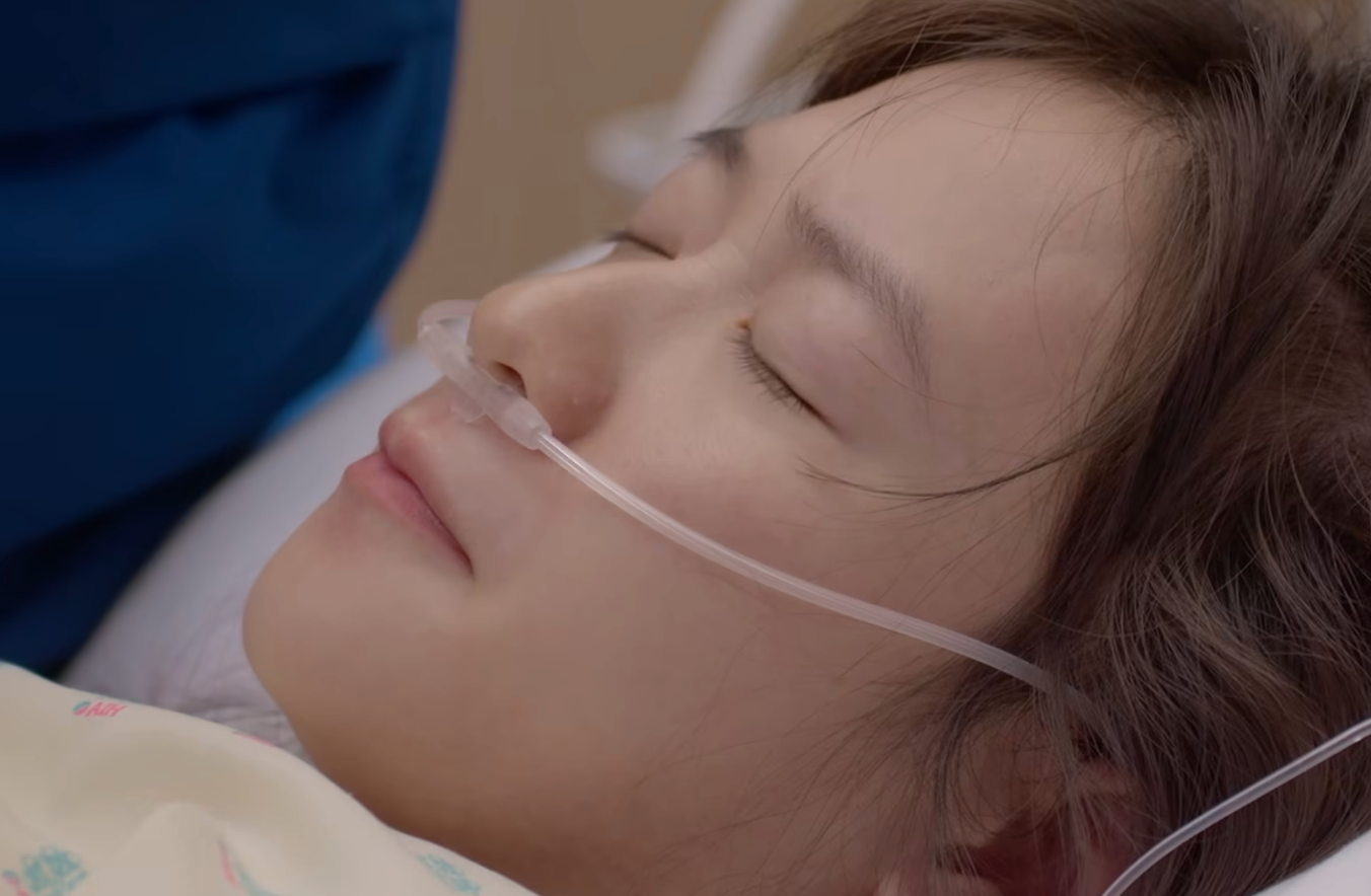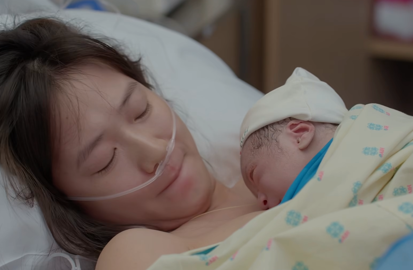 Cận cảnh nhan sắc của Trâm Anh trong khoảnh khắc vượt cạn chào đón thiên thần nhỏ. (Ảnh chụp từ clip).