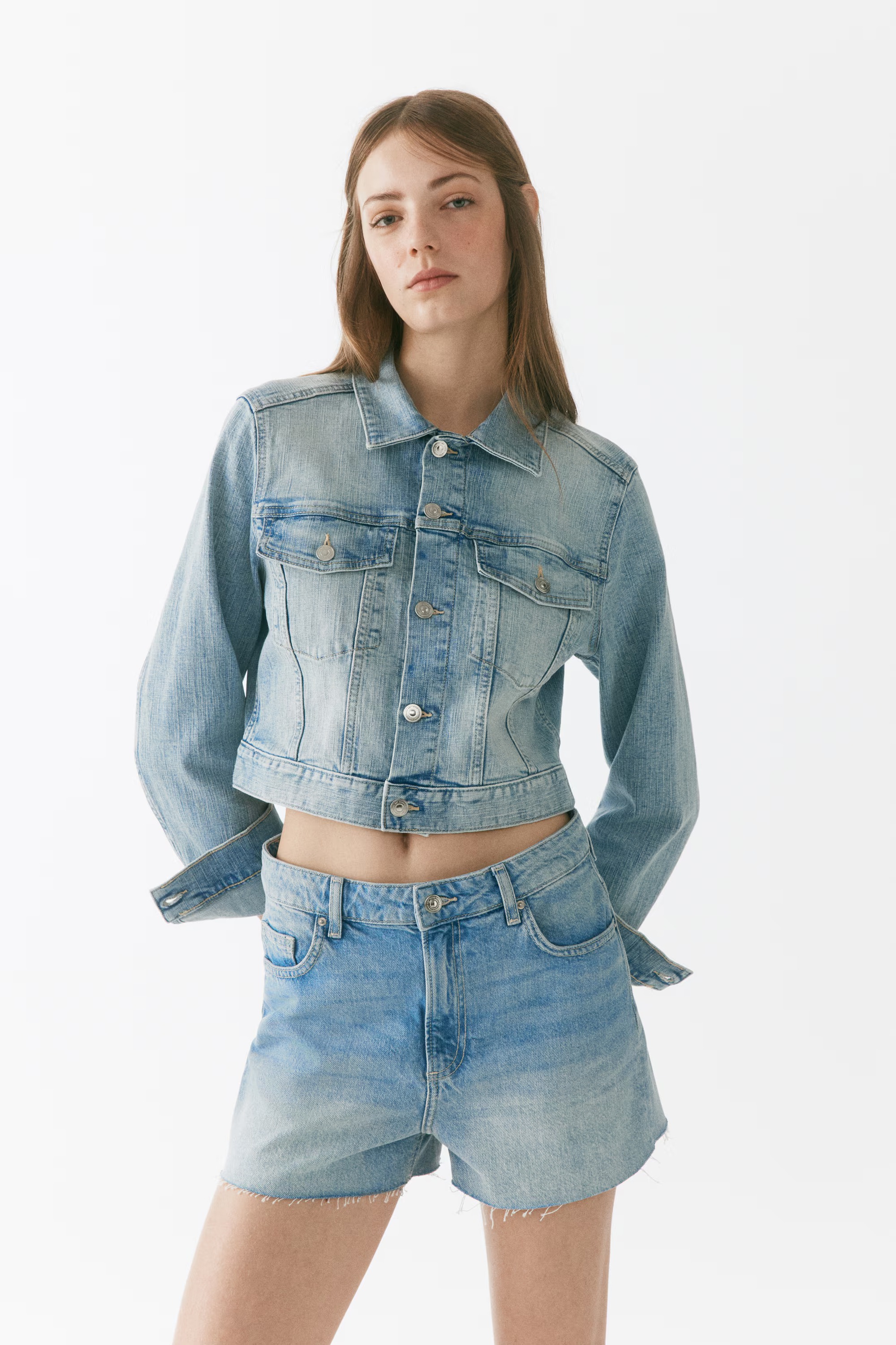 Đi cùng đó là quần short jeans dáng hơi lửng, item đang quay lại mạnh mẽ trong thời gian gần đây. So với kiểu quần siêu ngắn thường thấy, thiết kế này tạo cảm giác phóng khoáng hơn, cá tính hơn và có chút hơi thở Y2K rất hợp xu hướng. Trên người Hướng Hàm Chi, chiếc quần giúp làm nổi bật đôi chân thon dài, đồng thời tôn rõ tỷ lệ eo - hông đẹp mắt vốn là lợi thế hình thể của cô.