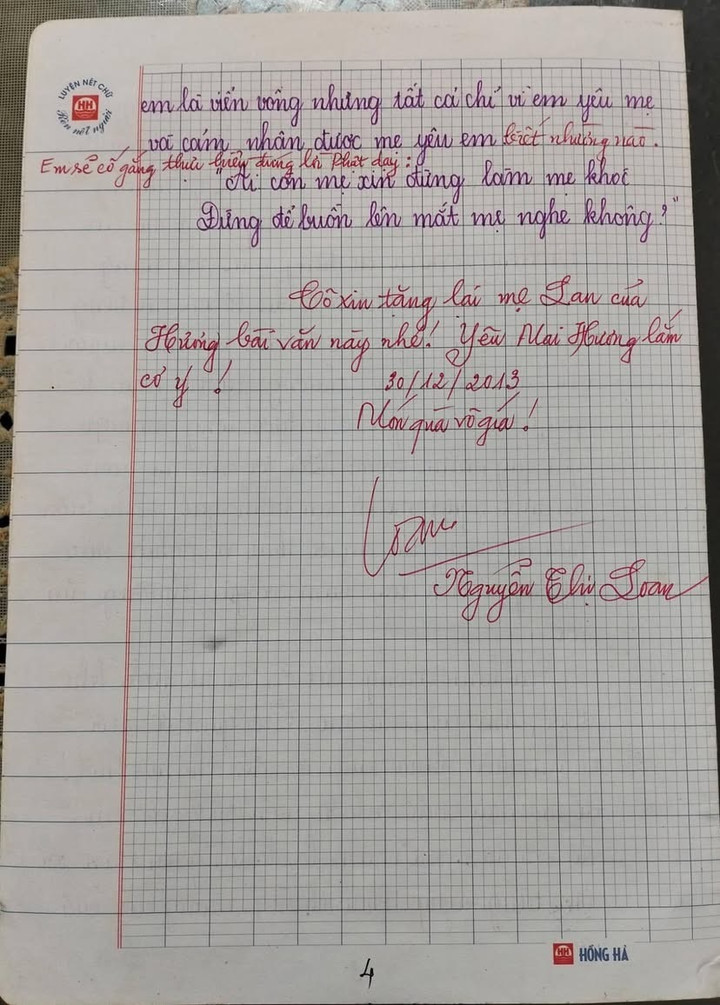 "Bài viết rất cảm động, đáng khen. Cô xin tặng lại mẹ Lan của Hương bài văn này. Yêu Mai Hương lắm cơ ý!" , cô giáo Nguyễn Thị Loan viết nhận xét cuối bài.