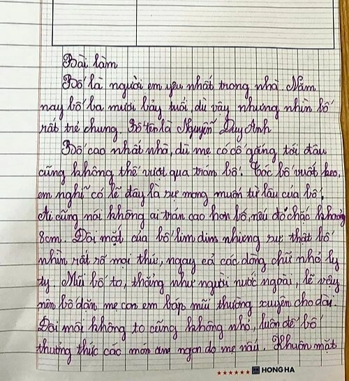 Mở đầu, cậu bé giới thiệu rất chuẩn chỉnh: bố là người em yêu nhất trong nhà, năm nay 37 tuổi nhưng vẫn rất trẻ trung. Nhưng chỉ vài dòng sau, bài văn bắt đầu đi theo một hướng không ai ngờ tới vừa hồn nhiên, vừa “sáng tạo” theo cách rất riêng của trẻ con.