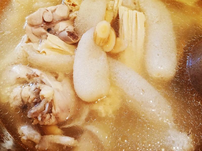 Bước 2: Tiếp theo, chuẩn bị một nồi hầm bằng đất nung hoặc nồi sứ rồi cho thịt gà, củ mài, hoàng kỳ và gừng thái lát vào. Tiếp theo thêm lượng nước vừa đủ vào (tốt nhất là cho đủ nước ngay từ đầu, vì thêm nước trong quá trình nấu sẽ ảnh hưởng đến hương vị của canh). Đặt lên bếp, đun sôi ở mức lửa lớn rồi giảm về mức lửa nhỏ ninh trong khoảng 1-1.5 giờ. Điều quan trọng là phải giảm lửa nhỏ ngay sau khi đun sôi để các chất dinh dưỡng và hương vị của gà được giải phóng từ từ. Nên dùng nồi đất nung hoặc nồi sứ vì chúng giữ nhiệt tốt và tạo ra món canh đậm đà hơn.