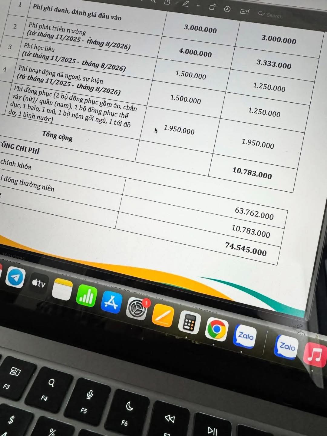 Tiếp theo là khoản học phí chính khóa: 63.762.000 đồng, tổng cộng đưa tổng chi phí 6 tháng đầu đời đi học của bé lên đến 74.545.000 đồng, tương đương khoảng 12,4 triệu đồng/tháng.
