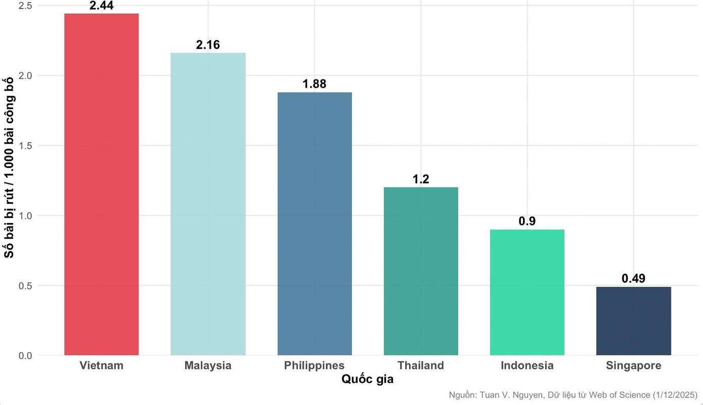 Số liệu GS. Nguyễn Văn Tuấn thu thập cho thấy Việt Nam đứng số 1 về số bài báo bị thu hồi trong vùng Đông Nam Á. Trong đó, tỉ lệ thu hồi thô: 2,55/1.000 bài; tỉ lệ thu hồi chính thức 2,44/1.000 bài.