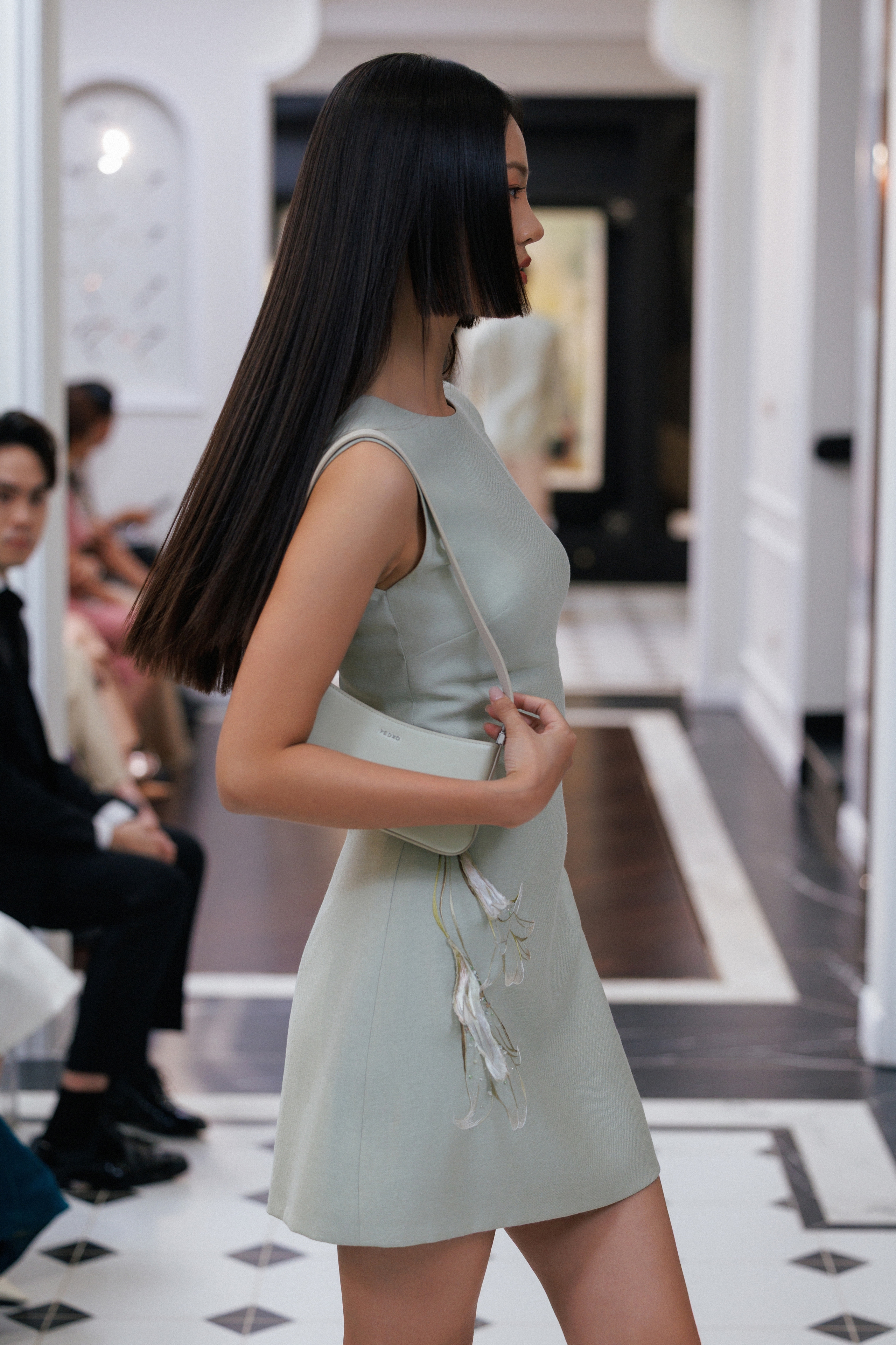Ngôn ngữ thời trang di sản đương đại của XUANLE hiện diện qua hoạ tiết lụa tơ tằm được thiết kế độc bản của riêng thương hiệu cùng hoạ sĩ Thuỵ Sỹ gốc Việt Minh Phạm, tái diễn dải màu sắc, dáng hình loài hoa huệ tây một cách mềm mại, lắng sâu.