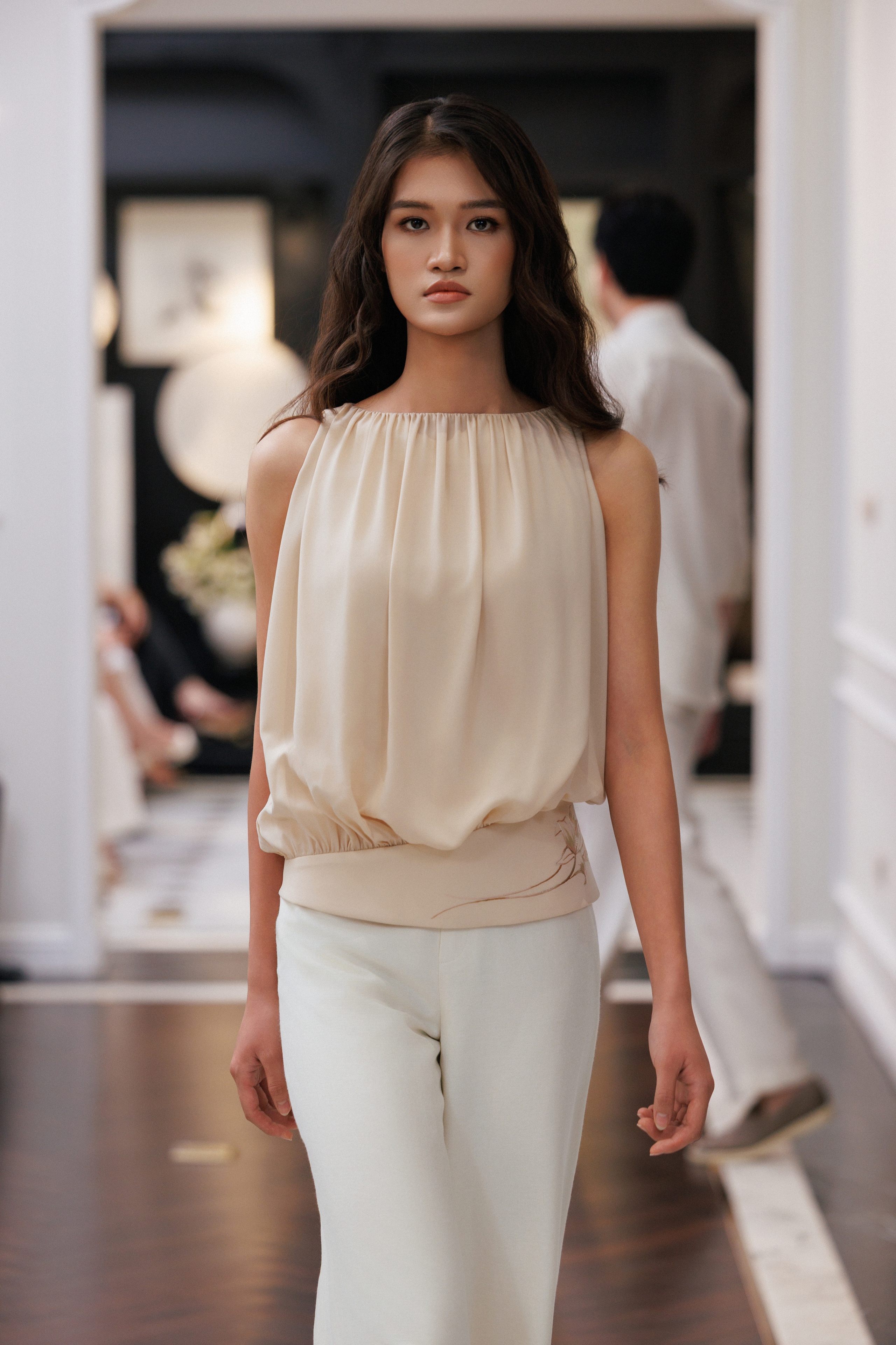 NSƯT Chiều Xuân xuất hiện nền nã, cổ điển trong thiết kế dạ hội Eternal Peony, với dấu ấn kỹ thuật phối chỉ chuyển sắc cao cấp của thương hiệu. Bên cạnh đó, Hồng Khanh - diễn viên của phim ‘Thế hệ kỳ tích’ mang đến tinh thần trẻ trung, nhẹ nhàng trong thiết kế organza kết hợp chân váy trắng, tạo nên một đối thoại thị giác giữa hai thế hệ.