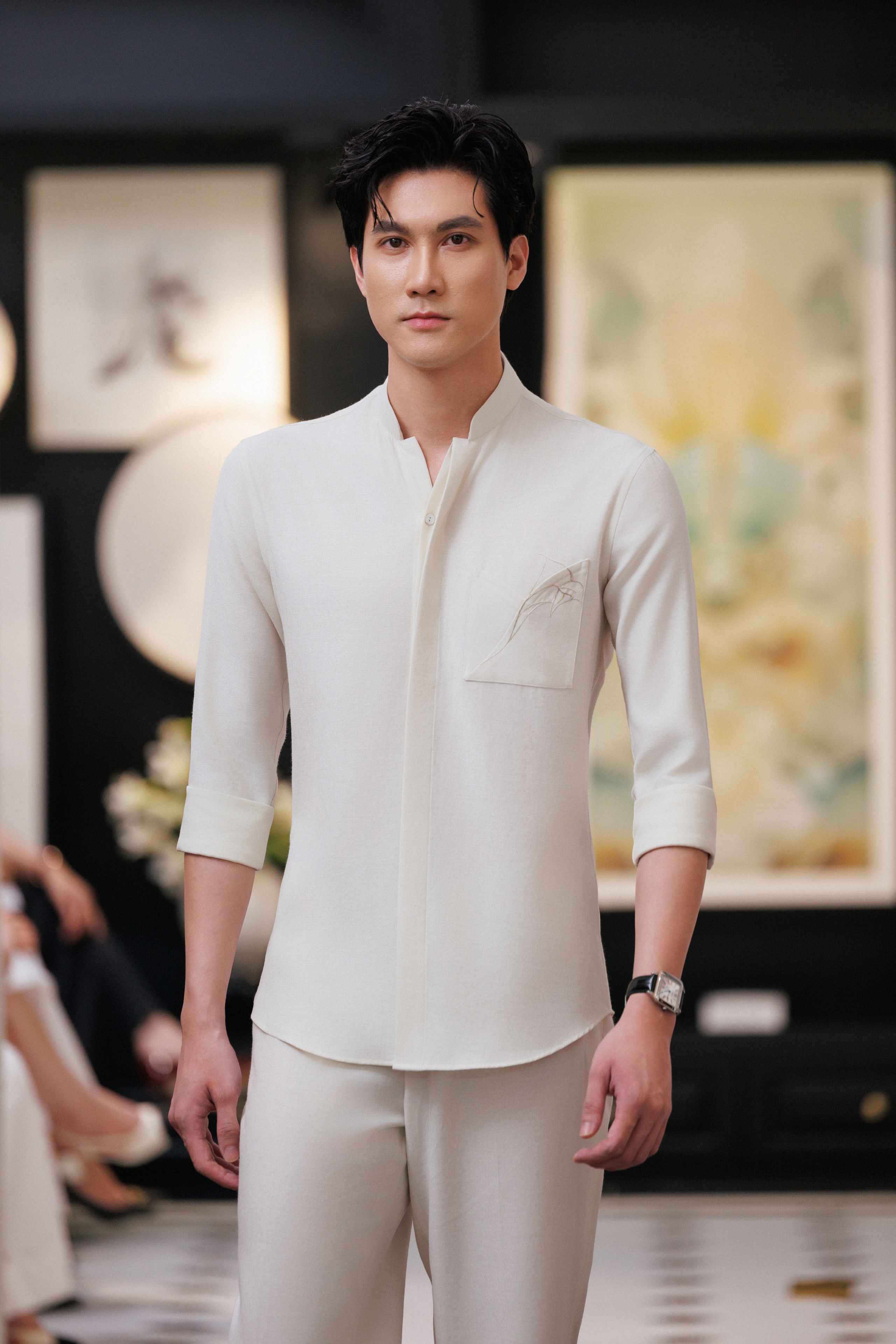 Đường thêu hoa huệ tây cách điệu được đặt chính xác như một dấu ấn nhận diện tinh tế. Các mảng vải được ghép phối theo sắc độ gần nhau, tạo chiều sâu thị giác. Đường cắt cúp cong được kiểm soát chặt, ôm theo cơ thể, hoàn thiện một phong cách workwear mang tinh thần đương đại cho các quý ông.