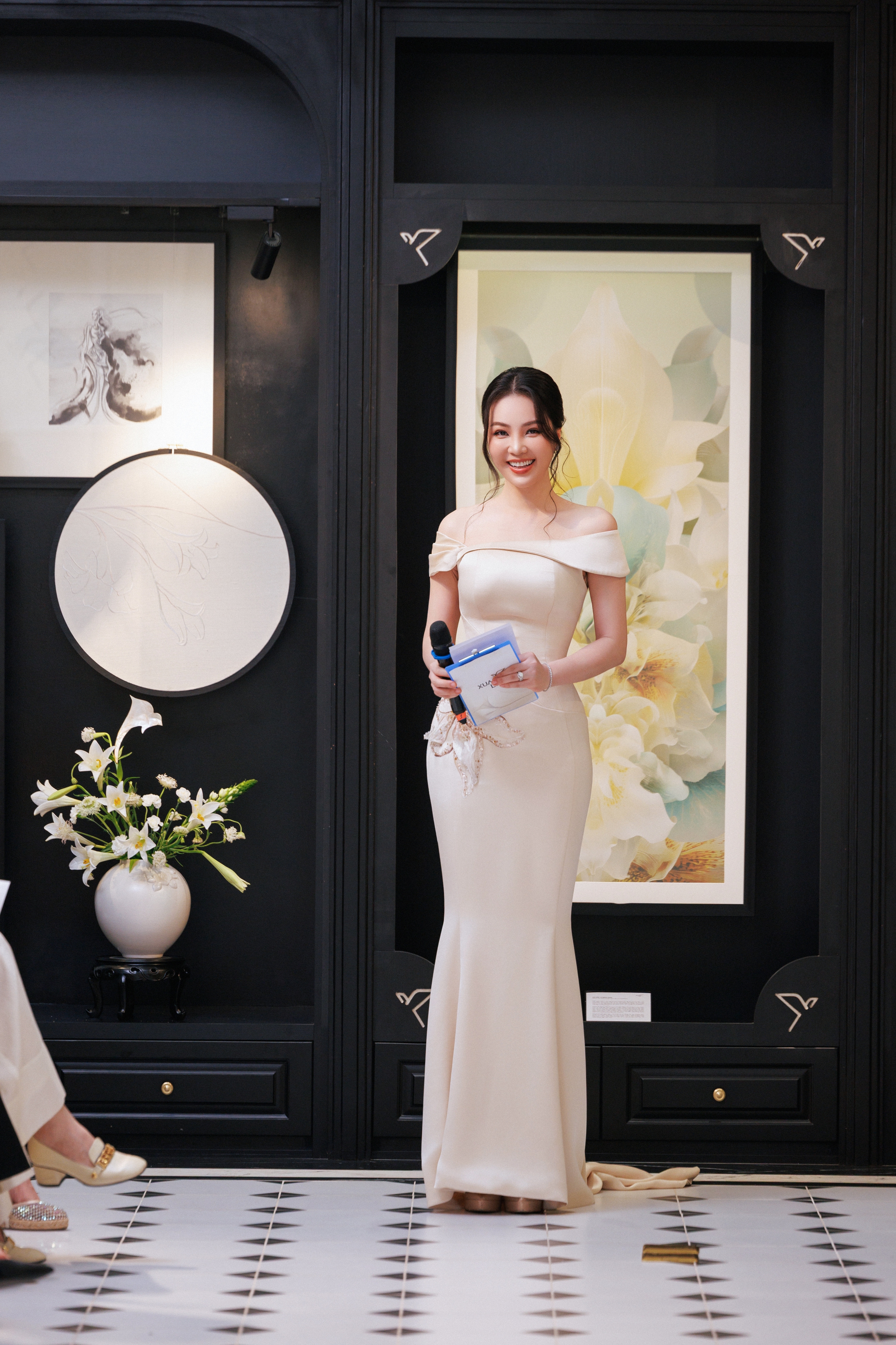 Không gian triển lãm còn trưng bày các mẫu phác thảo, kỹ thuật thủ công cao cấp và dòng vải lụa tơ tằm độc quyền mà NTK Xuân Lê kết hợp với hoạ sĩ người Thuỵ Sĩ gốc Việt - Minh Phạm. Lấy dáng hình loài hoa huệ tây làm trung tâm của sự chuyển hoá tinh thần THINH LẶNG, màu sắc, dáng hình loài hoa đặc trưng của tháng 4 đã được tái diễn giải bằng ngôn ngữ thời trang đương đại để trở thành cảm hứng cho bộ sưu tập Xuân Hè 2026 của thương hiệu.