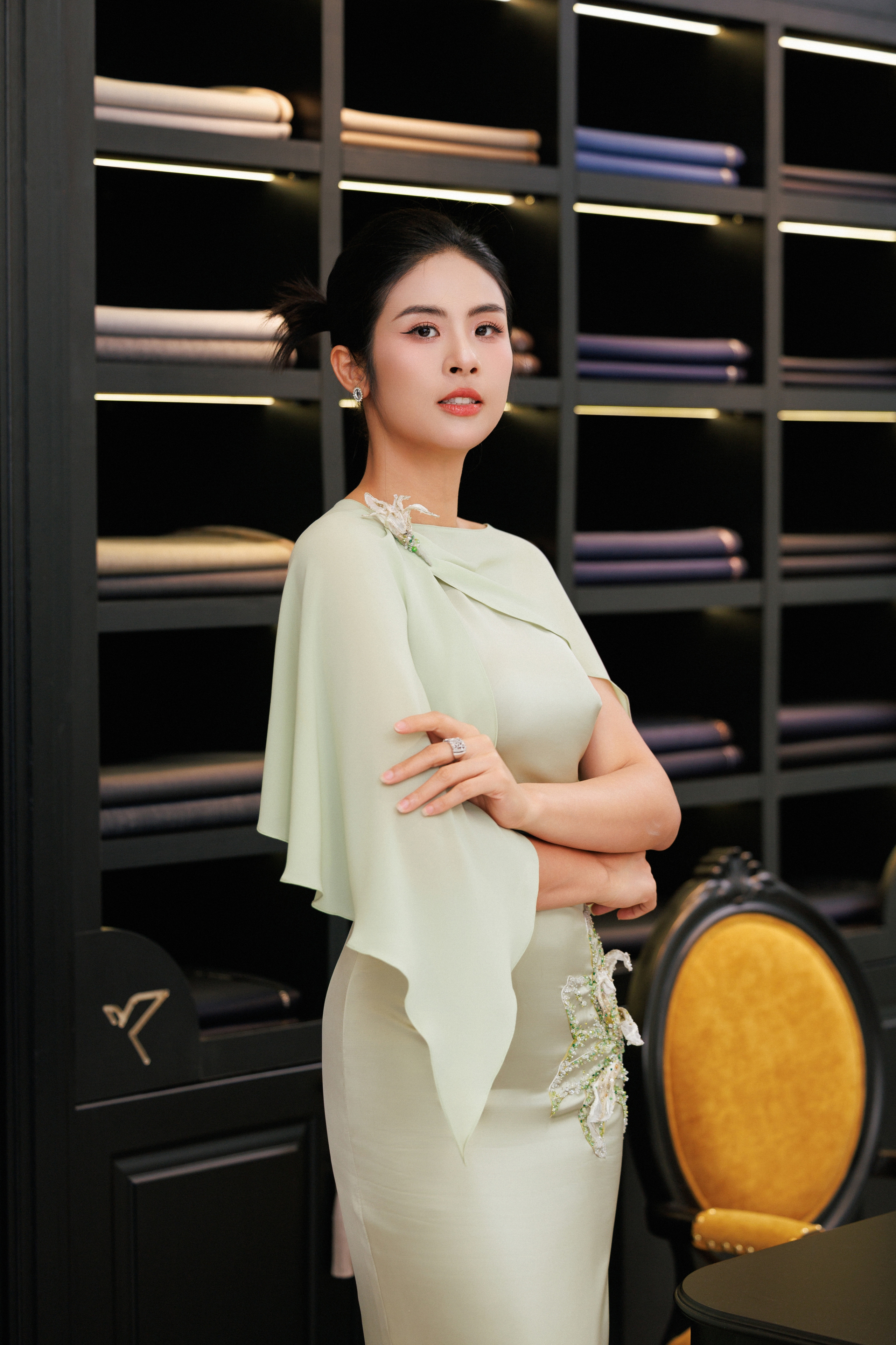 Diễn viên Bảo Thanh xuất hiện cùng chồng trong bộ sưu tập mới nhất - Thinh Lặng’26. ‘Bà mẹ hai con’ diện thiết kế nhẹ nhàng, tinh tế với điểm nhấn tại phần cổ với chi tiết hoa huệ tây ba chiều trong khi ông xã lịch lãm trong mẫu suit đũi và áo sơ mi lụa tơ tằm cao cấp.