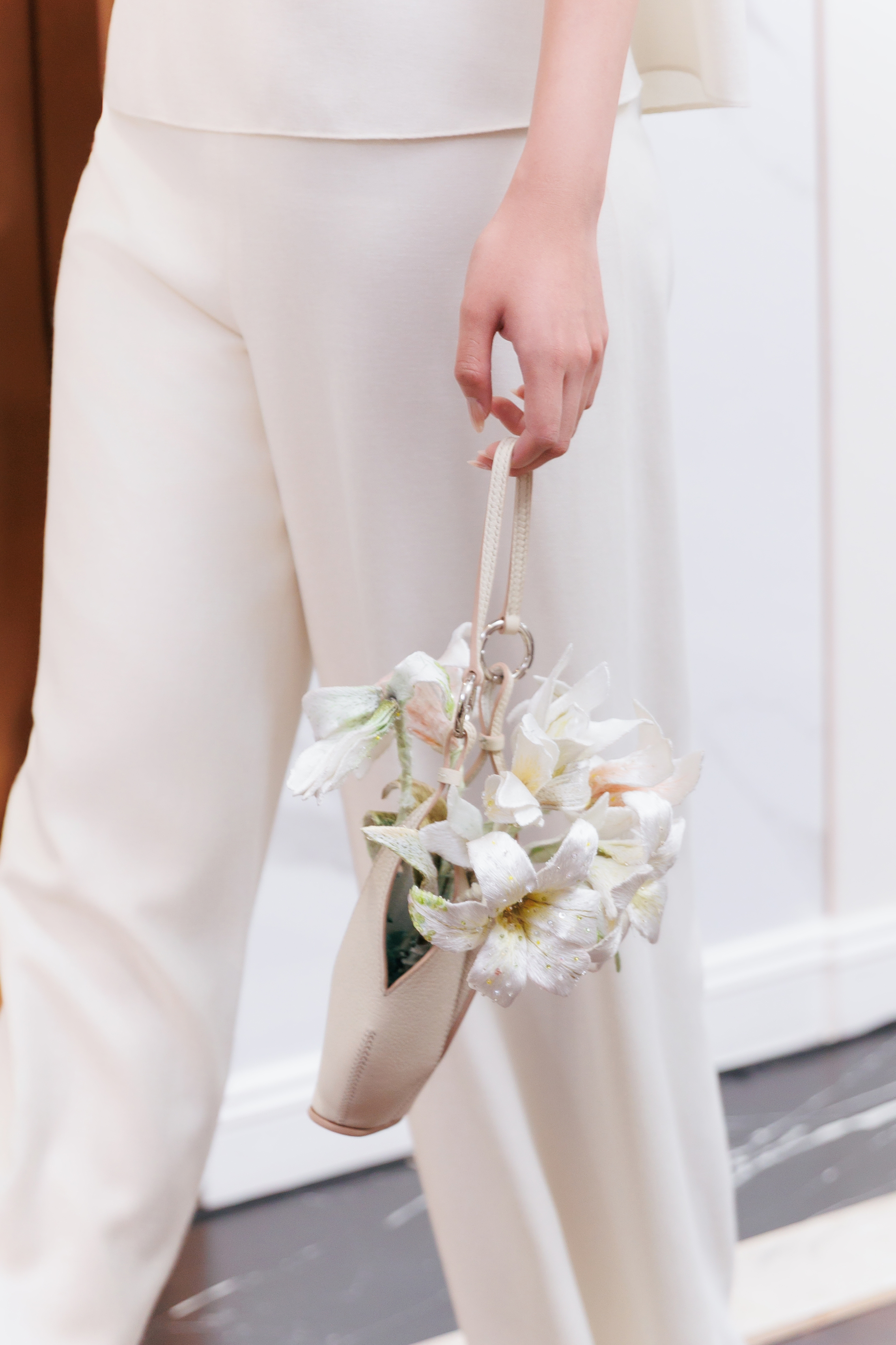 Trong bộ sưu tập, kỹ thuật thủ công được thể hiện tinh tế, thể hiện đặc trưng của thương hiệu. Tạo tác hoa ba chiều định hình những cánh hoa huệ tây bung nở trên bề mặt, kết hợp cùng kỹ thuật thêu chuyển sắc và đính kết, tạo nên chiều sâu thị giác. Vẻ đẹp tính nữ được soi chiếu trong một cảm thức thinh lặng mới.