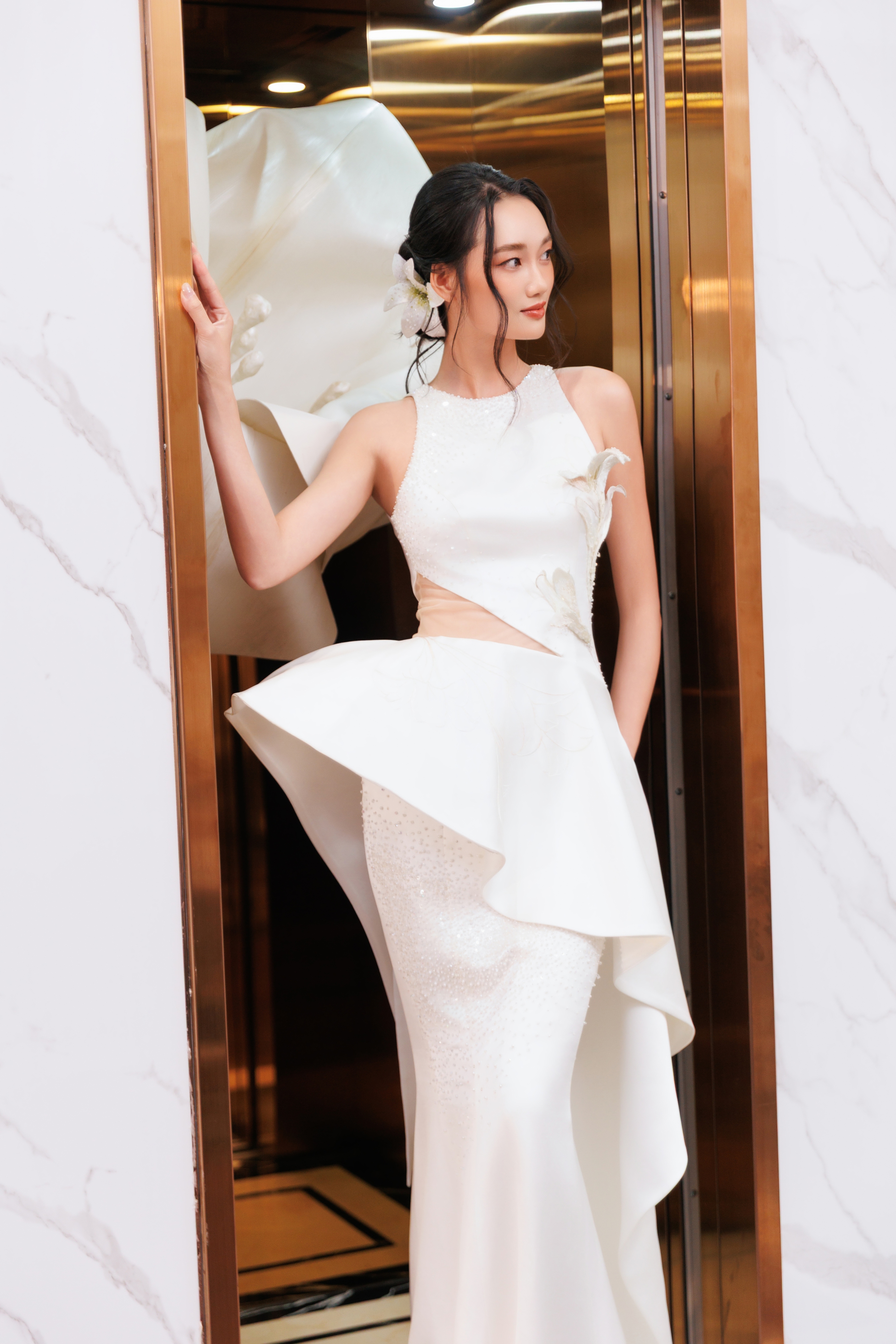 Hoa hậu Ngọc Hân xuất hiện nền nã, sang trọng trong thiết kế đầm dạ hội độc bản của XUANLE. Hình ảnh hoa huệ tây được cách điệu qua chi tiết tạo tác hoa ba chiều, kết hợp cùng những đường cắt cong mềm tại phần xẻ tà và tà choàng, tạo nên một chuyển động nhẹ, gợi cảm thức thanh thoát và lắng đọng.