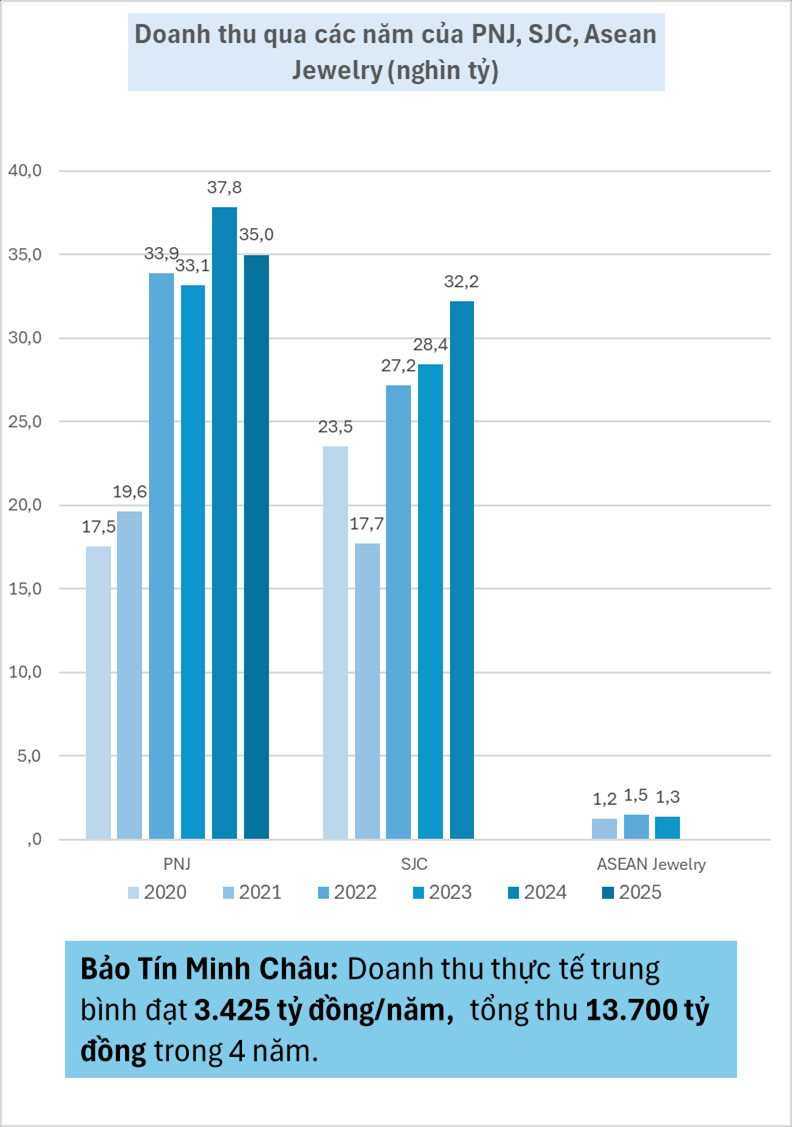 Ở phân khúc quy mô nhỏ hơn, các công ty như ASEAN Jewelry duy trì mức doanh thu ổn định quanh ngưỡng 1.200 đến 1.500 tỷ đồng mỗi năm.