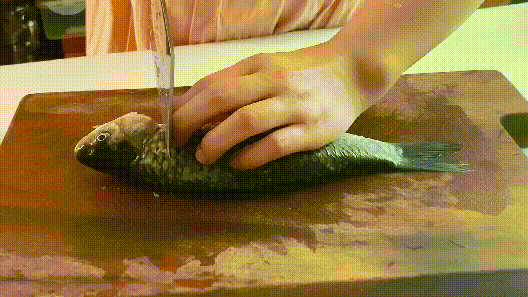 Để có nồi canh trắng sánh bắt mắt, khâu xử lý cá là mấu chốt. Cá tươi được làm sạch mang và nội tạng, cạo kỹ màng đen trong bụng để bớt mùi. Một mẹo nhỏ là rạch nhẹ ở đầu và đuôi rồi dùng mũi dao kéo nhẹ để lấy đường gân tanh ở sát xương sống. Không phải ai cũng quen với thao tác này, nhưng chỉ cần thử một lần sẽ thấy nước canh bớt hăng và ngọt trong hơn. Dùng dao khía hai ba đường chéo mỗi bên thân cá để gia vị dễ thấm, khi nấu ra vị ngọt nhanh hơn.