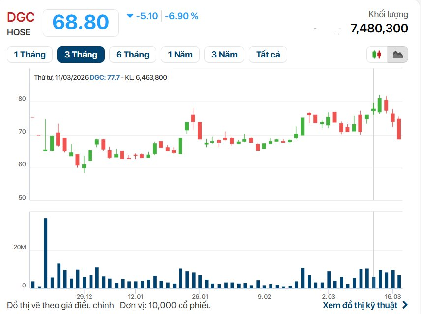 Trên thị trường chứng khoán, ngay sau khi các thông tin liên quan đến ban lãnh đạo được công bố, cổ phiếu DGC của Hóa chất Đức Giang ghi nhận sức ép bán ra. Phiên giao dịch ngày 17/3/2026, thị giá DGC giảm sàn , lùi về mức 68.800 đồng/cổ phiếu. Khối lượng giao dịch của DGC tính đến thời điểm này đạt 7.330.400 đơn vị.