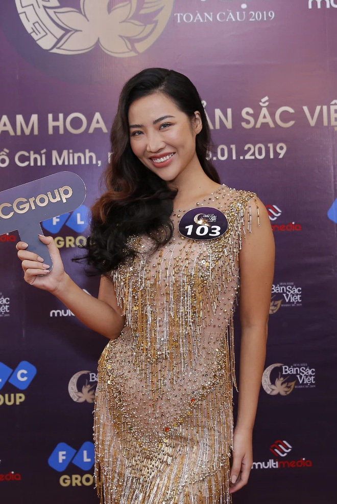 Trước đó, tại cuộc thi Hoa hậu Bản sắc Việt toàn cầu 2019, người đẹp này chọn trang phục "tem tém" hơn nhưng vẫn đủ để phô diễn nhược điểm vóc dáng, khoe luôn vòng hai có phần đẫy đà