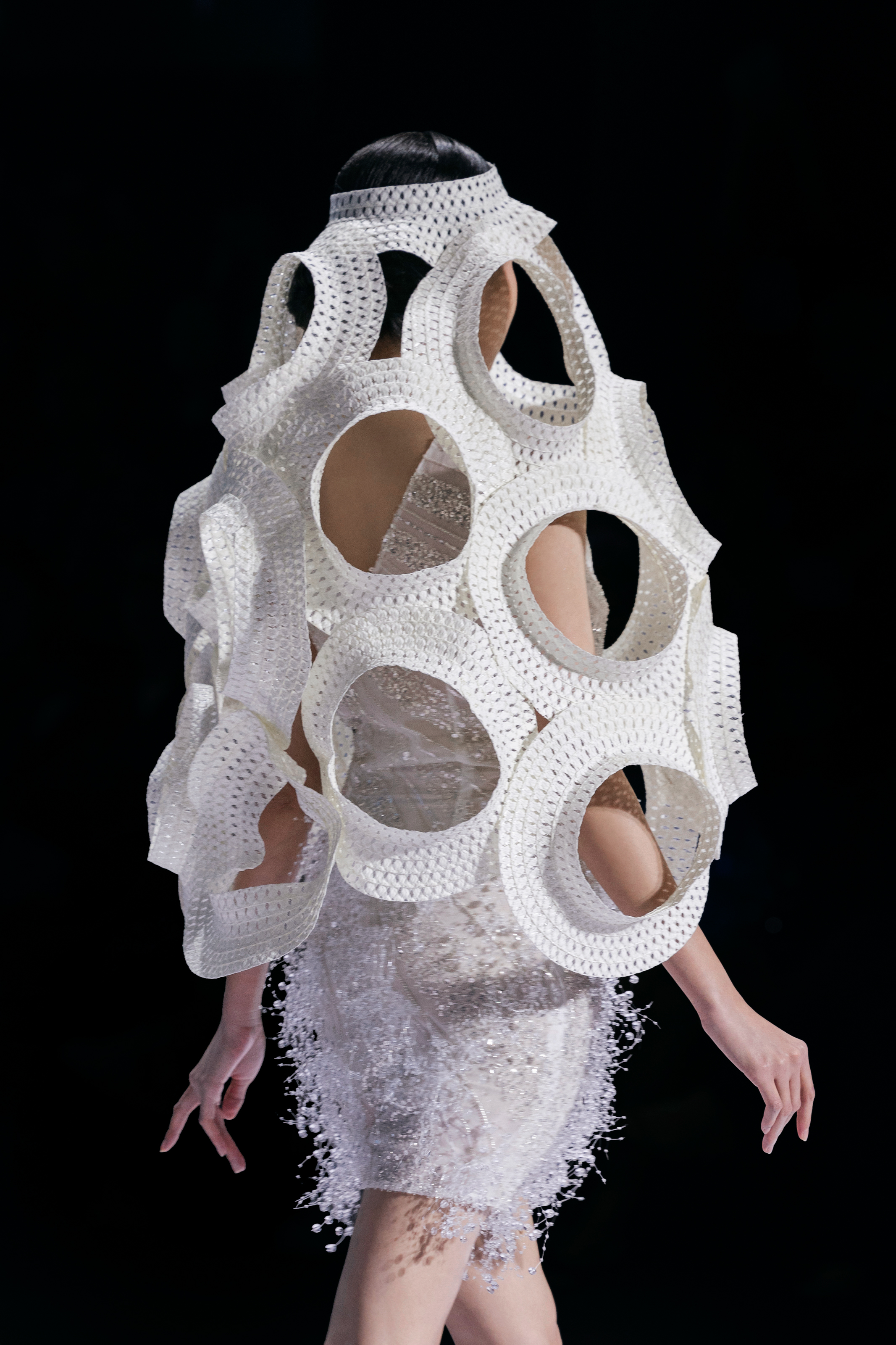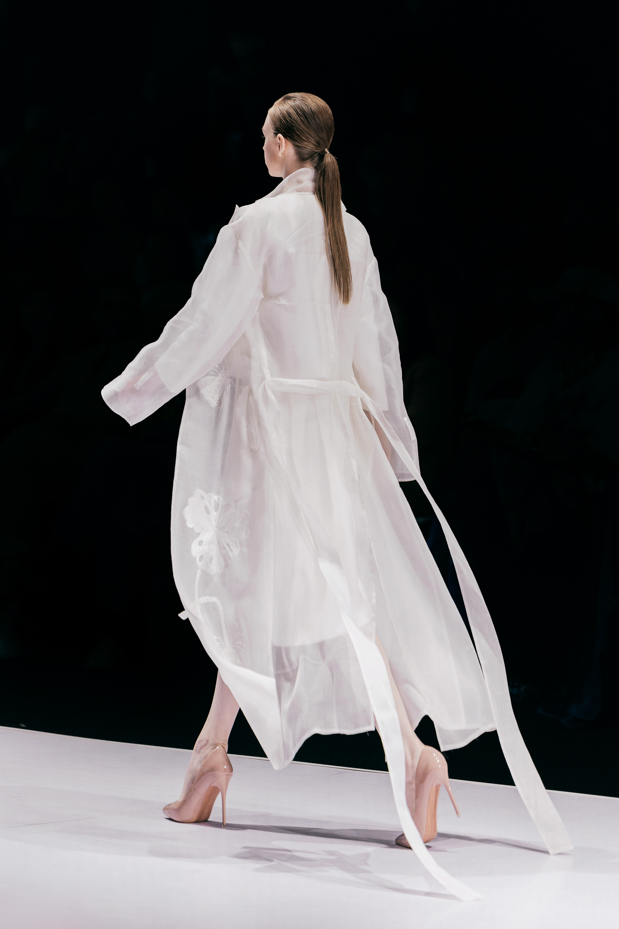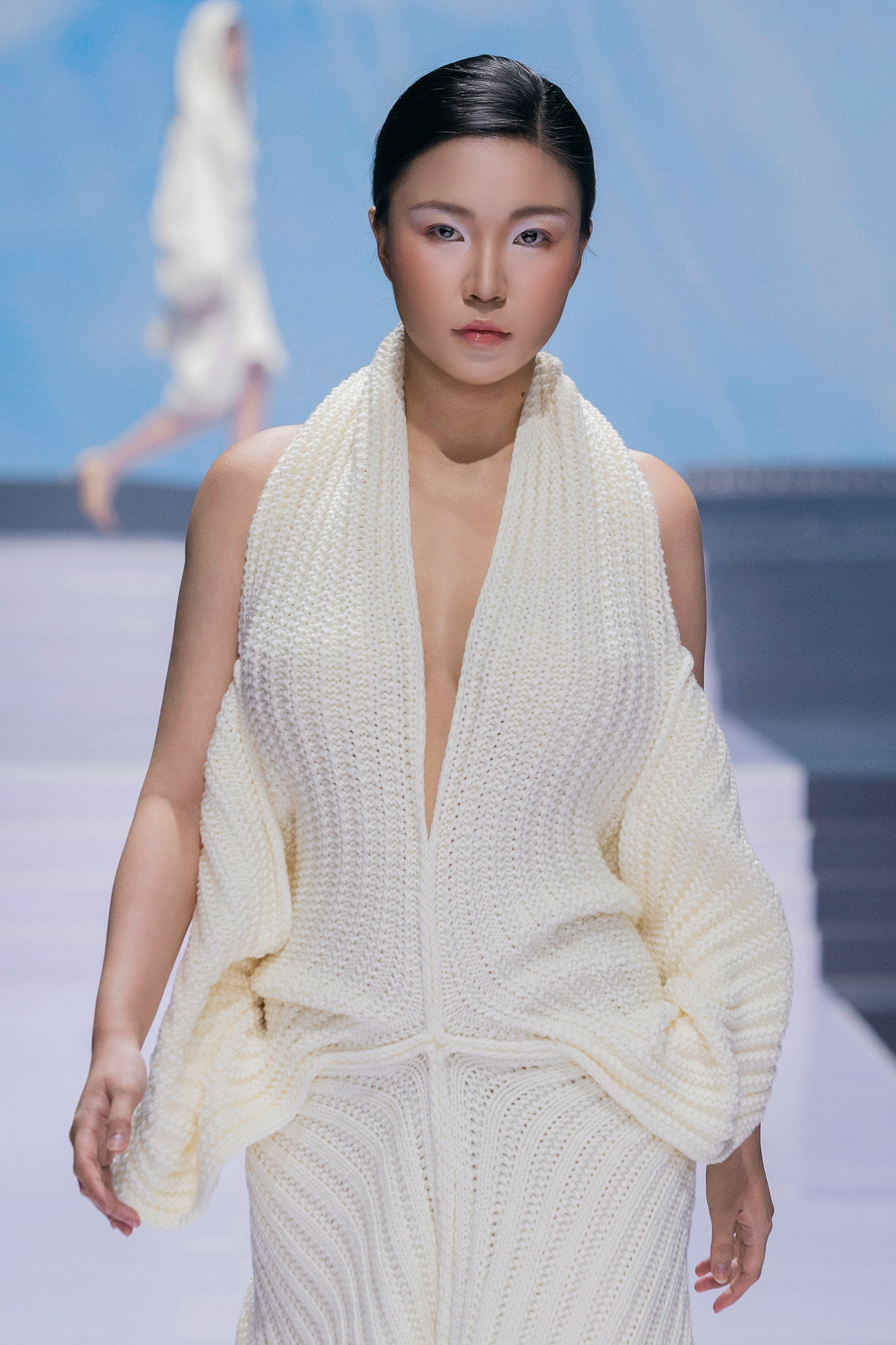 Khoác lên mình thiết kế lụa trắng ánh bạc trên nền voan đính đá lấp lánh, Quán quân Vietnam’s Next Top Model 2025 Mai Hoa dẫn dắt khán giả bước vào hành trình khám phá vẻ đẹp của kỹ thuật thủ công trên tơ tằm và len trong show diễn tối 12/11 tại Hà Nội. Bộ cánh của cô mang điểm nhấn với cấu trúc vòng tròn 3D bao quanh phần đầu và ngực, gợi hình ảnh những giọt nước đang chuyển động liên tục. Sắc trắng và độ nhẹ của lụa tạo cảm giác trong trẻo, thuần khiết, giúp từng bước catwalk của người đẹp thêm uyển chuyển.