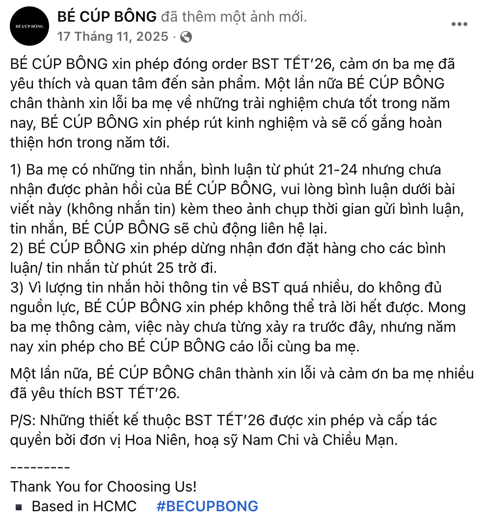 Đặc biệt, vào tháng 11 vừa qua, thương hiệu BÉ CÚP BÔNG đã khiến cộng đồng mẹ bỉm "dậy sóng" khi vừa mở order đã nhanh chóng rơi vào tình trạng quá tải chỉ sau vỏn vẹn 2 phút. Thời điểm đó, Tết vẫn còn cách hơn hai tháng, nhưng hàng nghìn bà mẹ đã không ngần ngại canh giờ, tranh nhau đặt đồ Tết cho các bé. Hiện tượng "vỡ trận" này không chỉ cho thấy sức hút khủng khiếp của BÉ CÚP BÔNG mà còn phản ánh tâm lý sẵn sàng chi tiền sớm để con có những bộ đồ Tết chỉn chu, độc đáo và mang dấu ấn riêng.