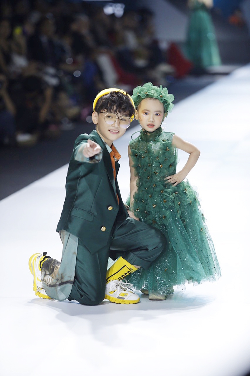 Bé Hà My được mẫu nhí Win dắt tay trên sân khấu, trình diễn BST của NTK Nguyễn Thảo.