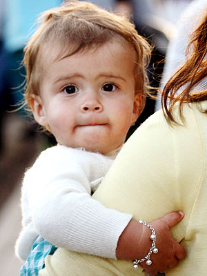 Honor Marie Warren mím đôi môi xinh xắn khi đi cùng mẹ trên bãi biển Malibu, California hôm 23 tháng 5. Lúc này bé 11 tháng tuổi, bé được thay đồ, đội mũ rộng vành và được mẹ cho thả chân xuống nước đùa sóng |
