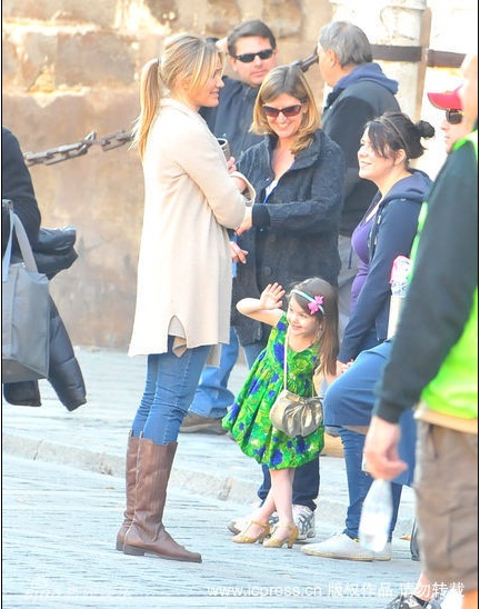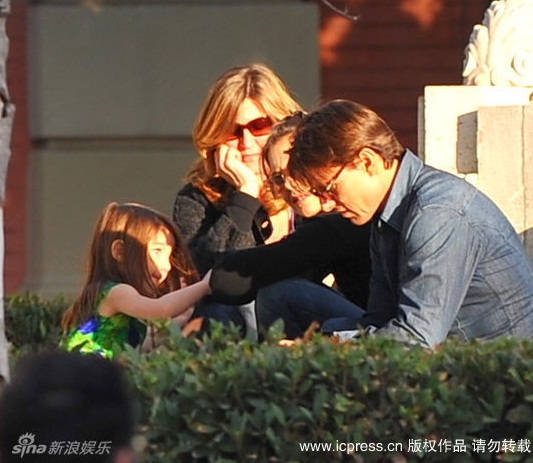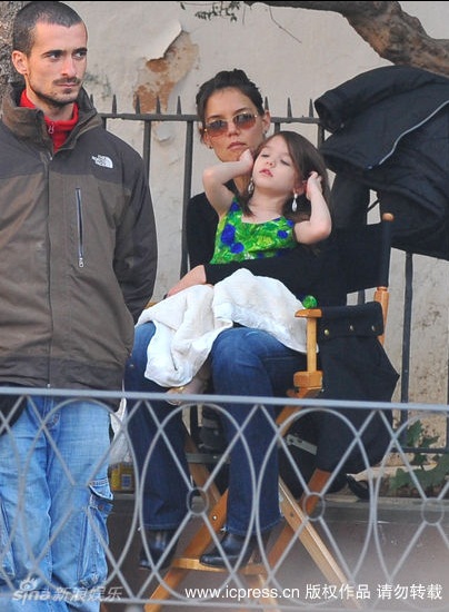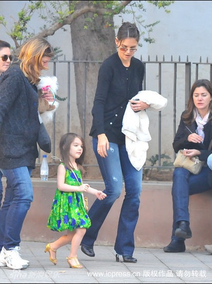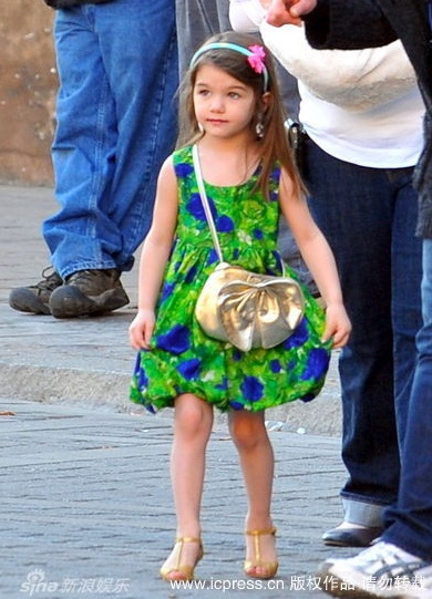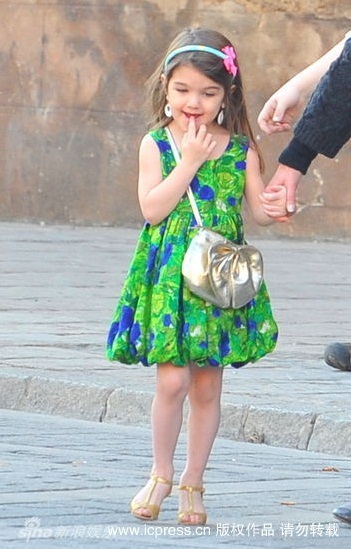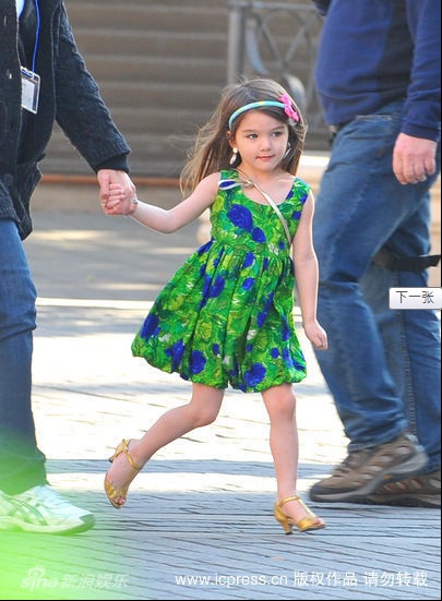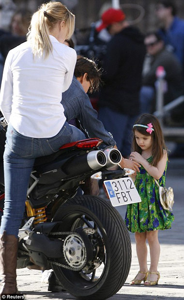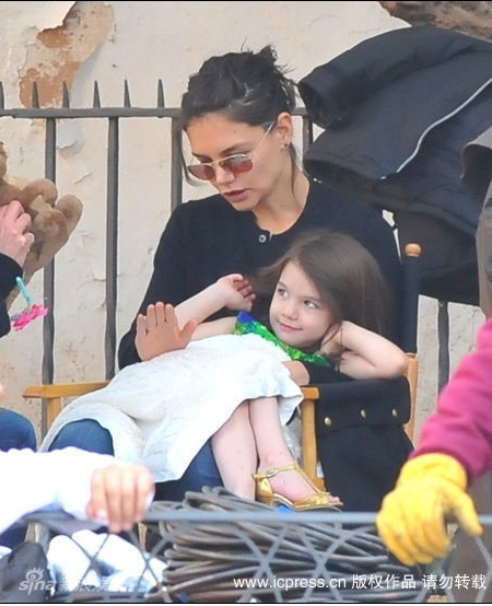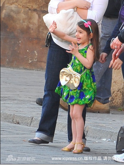 Hôm 11/12, bé Suri được mẹ đưa tới phim trường tại Seville, Tây Ban Nha, xem Tom đag diễn xuất trong bộ phim Knight And Day. Duyên dáng với chiếc váy xanh, cô bé vừa xem bố vừa điệu đàng sửa bờm tóc, tô son làm duyên.