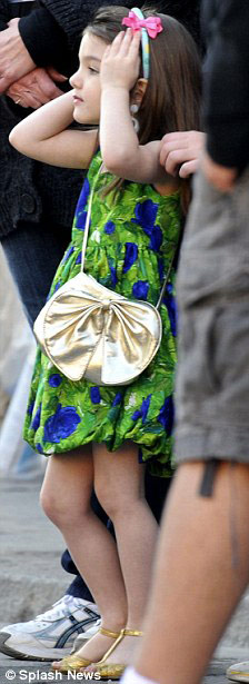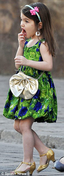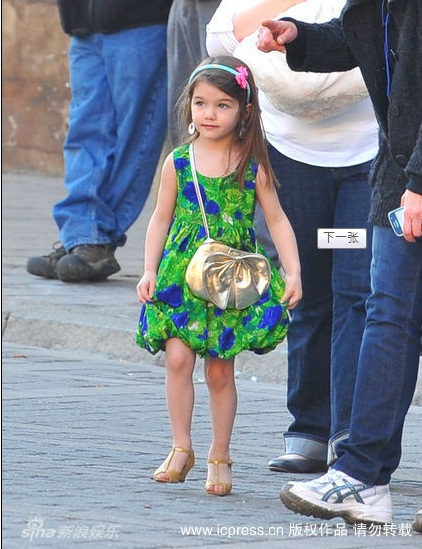 Váy xanh xinh, tóc cài bờm hồng, túi điệu bên hông, chân đi giày cao gót, thi thoảng lại lấy son trong túi xắc ra tô, Suri giống một thiếu nữ mới lớn hơn là một cô bé 3 tuổi.
