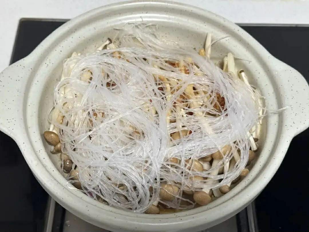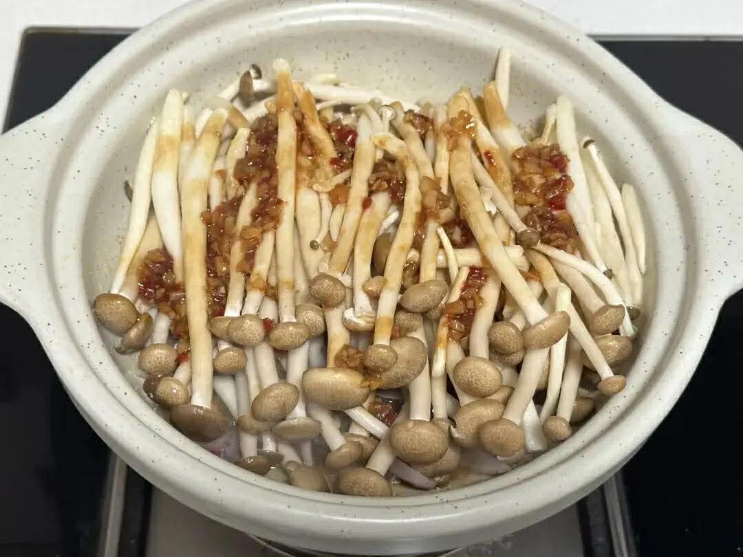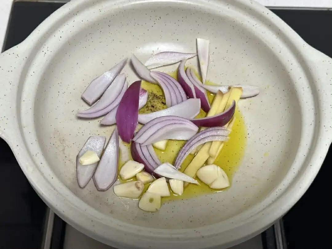 Bước 2: Cho một lượng dầu ăn vừa đủ vào nồi đất (hoặc nồi sành/sứ), sau đó cho hành tây, tỏi băm, gừng vào xào thơm. Tiếp theo bạn cho nấm hải sản vào và rưới một ít nước sốt tỏi lên trên. Sau đó bạn rải lớp miến lên trên nấm hải sản.