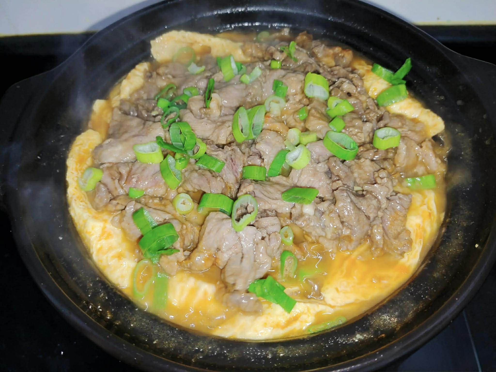 Bước 4: Tiếp theo bạn cho váng đậu ống vào hỗn hợp cà chua đã xào, dàn đều. Sau đó, cho thịt bò đã ướp lên trên váng đậu rồi đổ một lượng nước sôi vừa đủ vào dọc theo mép nồi, đậy nắp và đun nhỏ lửa. Khi nồi bắt đầu sôi, hãy bắt đầu canh thời gian. Khoảng mười phút sau khi sôi thì tắt bếp, mở nắp, rắc hành lá thái nhỏ lên trên để trang trí là món ăn đã sẵn sàng.