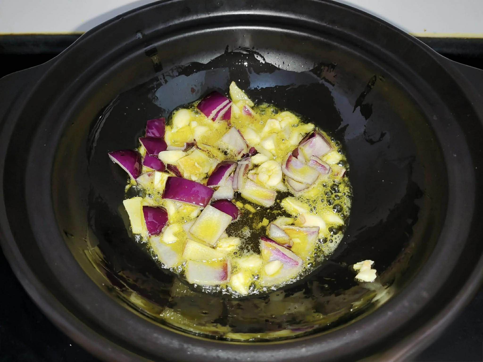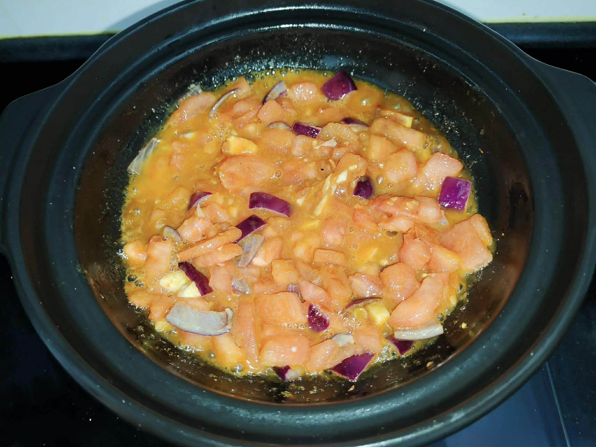 Bước 3: Hành tây bóc bỏ vỏ nâu rồi rửa sạch, thái nhỏ. Tỏi và gừng loại bỏ vỏ rồi băm nhỏ. Đặt nồi lên bếp, cho một chút dầu ăn vào rồi đun nóng. Khi dầu nóng thì cho tỏi cùng gừng băm vào phi thơm. Sau đó cho hành tây vào xào thơm. Tiếp đó, cho cà chua, chút muối và sốt cà chua vào, đảo đều cho đến khi cà chua tiết ra nước. Cuối cùng, rưới một ít nước tương vào và xào cho đến khi hòa quyện.
