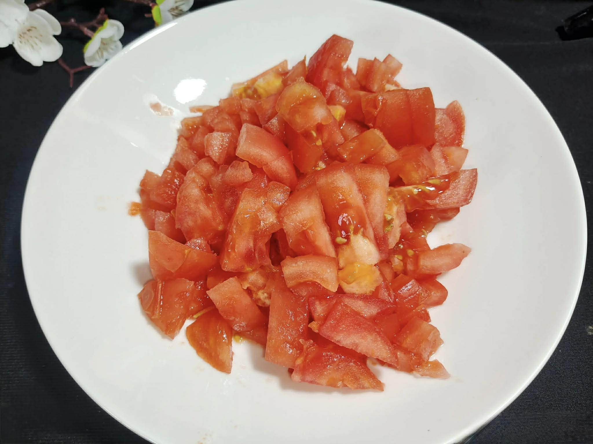 Bước 2: Thịt bò bạn rửa sạch sau đó dùng khăn bếp thấm khô nước. Sau đó cho thịt bò vào bát, thêm chút muối, tinh chất cốt gà và 1 thìa canh nước tương, trộn đều. Sau đó, thêm một thìa canh bột bắp và trộn đều rồi ướp trong khoảng 10 phút. Bạn nên dùng bột bắp làm mềm có chứa papain, ướp cùng sẽ giúp thịt bò mềm hơn. Nếu không có loại bột bắp này thì, bạn có thể dùng bột bắp thông thường với một ít baking soda. Cà chua rửa sạch, gọt vỏ và cắt thành các miếng nhỏ.