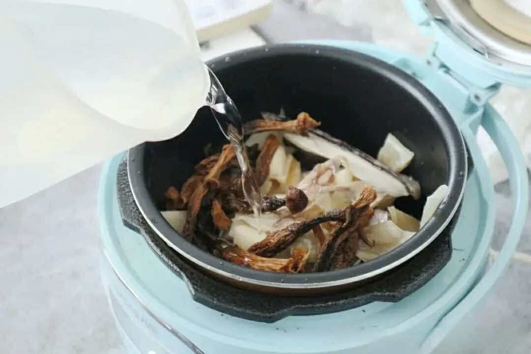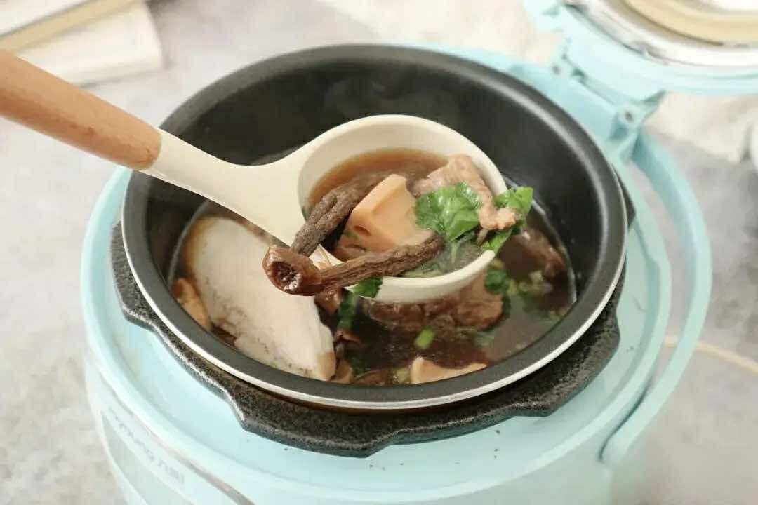Bước 3: Sau đó cho tất cả các nguyên liệu đã chuẩn bị vào nồi áp suất điện. Thêm lượng nước vừa đủ và chọn chế độ hầm canh. Khi hết thời gian, bạn xả van rồi mở nắp, thêm gia vị vừa ăn và tinh chất cốt gà để nêm nếm. Cuối cùng rắc một ít hành lá cắt khúc hoặc rau cần tây tùy theo sở thích, rồi lấy ra bát tô là có thể thưởng thức.