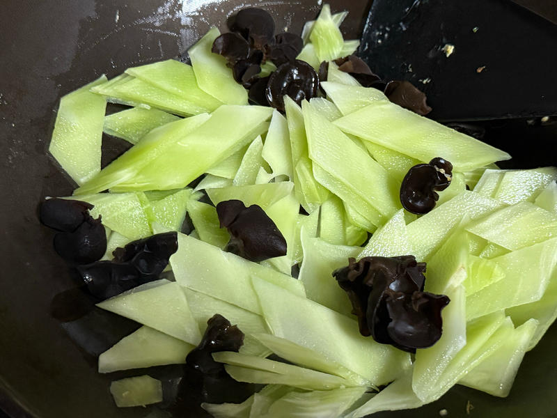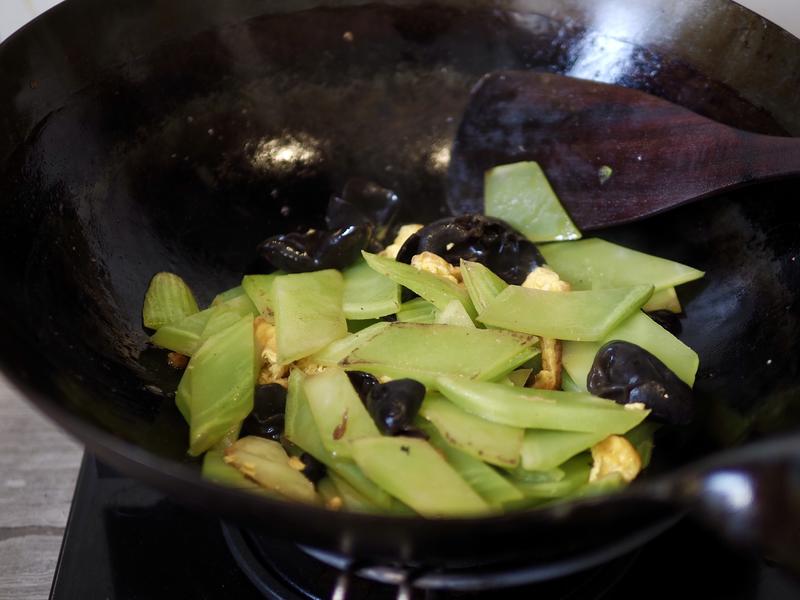 Bước 1: Tước vỏ và rửa sạch rau tiến vua sau đó thái mỏng. Ngâm mộc nhĩ cho nở mềm rồi rửa sạch và xé thành các miếng nhỏ. Đập trứng vào bát và đánh tan cùng với một chút muối. Sau đó đặt chảo lên bếp, thêm chút dầu ăn rồi đun nóng. Tiếp theo cho trứng vào chiên đến khi có dấu hiệu đông lại thì đảo đều cho chín rồi lấy ra, để riêng.