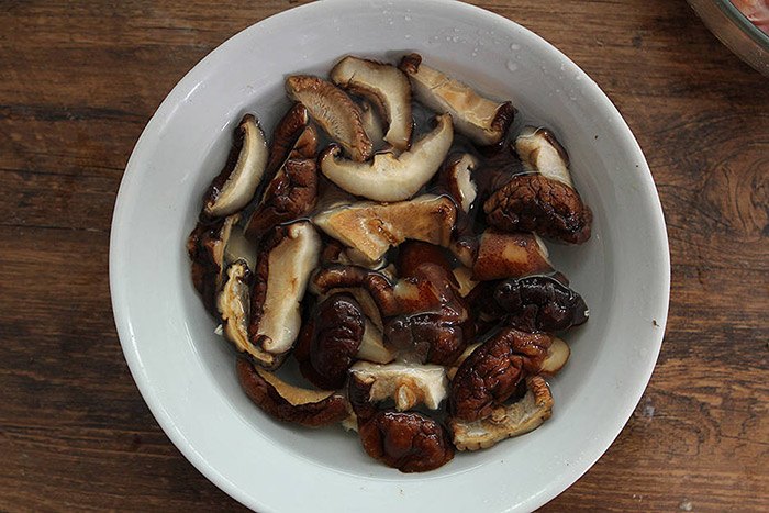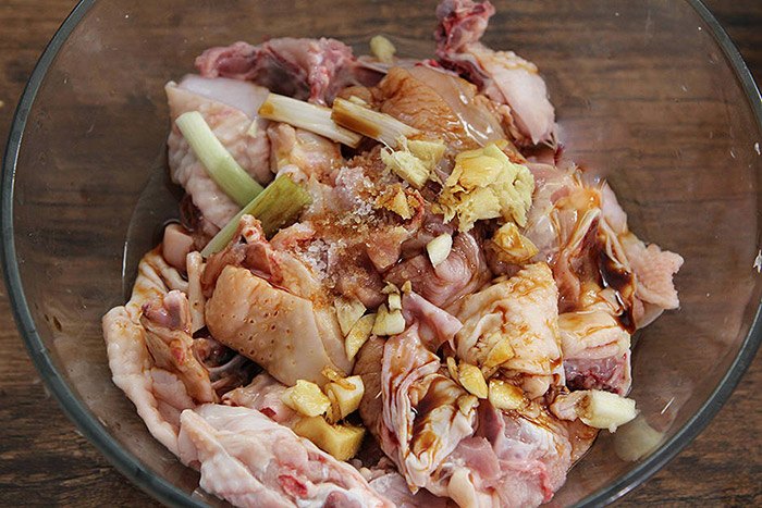 Bước 1: Sơ chế sạch thịt gà rồi chặt thành miếng vừa ăn. Cho thịt gà vào âu to, thêm hành lá, nước tương, gừng băm, rượu nấu ăn rồi trộn đều và ướp trong khoảng 15 phút. Ngâm nấm hương khô trong 30 phút, bỏ chân nấm và cắt làm đôi hoặc khía hai đường trên bề mặt để giúp nấm ngấm nước dùng.