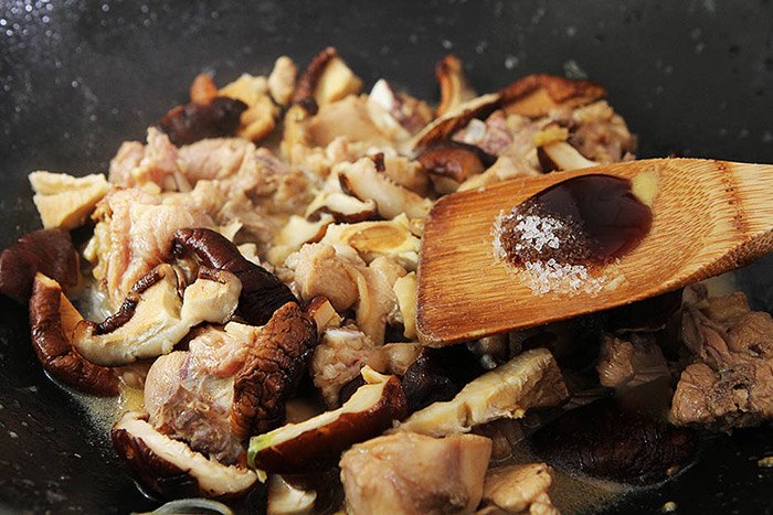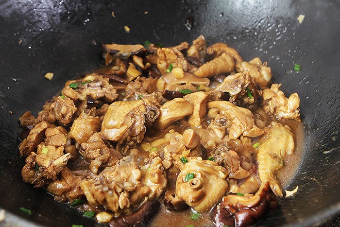Bước 2: Xào một chút gừng và hành lá trong nồi cho thơm, sau đó cho thịt gà đã ướp vào xào đến khi ngả màu hơi vàng. Thêm 1 muỗng canh rượu nấu ăn để khử mùi tanh, rồi cho nấm hương vào. Đổ một lượng nước nóng ngập các nguyên liệu, đun sôi trên lửa lớn. Sau đó giảm lửa nhỏ và ninh trong 1 giờ. Nấu cho đến khi nước dùng sánh lại và gà mềm. Nêm thêm muối cho vừa ăn, rắc hành lá thái nhỏ lên trên trước khi tắt bếp.