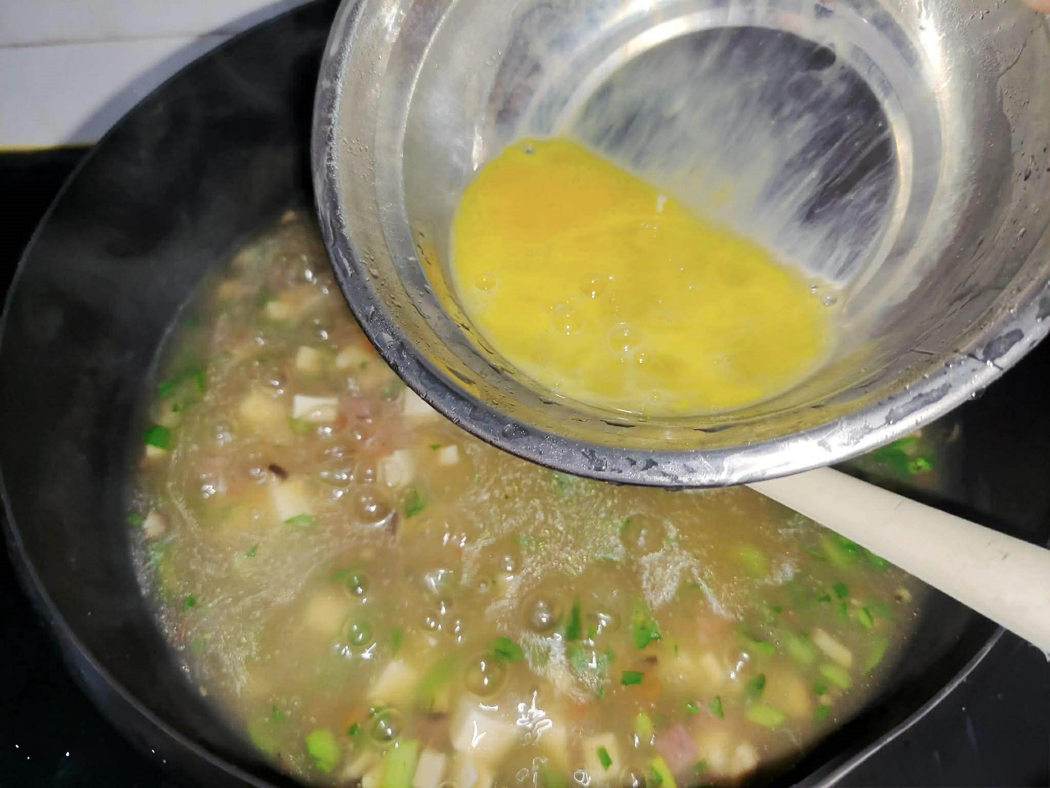 Bước 3: Sau đó đổ lượng nước sôi vừa đủ vào nồi, thả đậu phụ thái hạt lựu rồi đun sôi trên lửa lớn. Nêm muối, tiêu và một ít tinh chất cốt gà. Tiếp tục nấu trên lửa lớn khoảng 2 đến 3 phút để làm dậy mùi thơm của tất cả các nguyên liệu. Sau đó bạn từ từ đổ nước nước bột bắp vào nồi, giữ lửa lớn và khuấy nhẹ liên tục bằng thìa cho đến khi súp trở nên sánh.