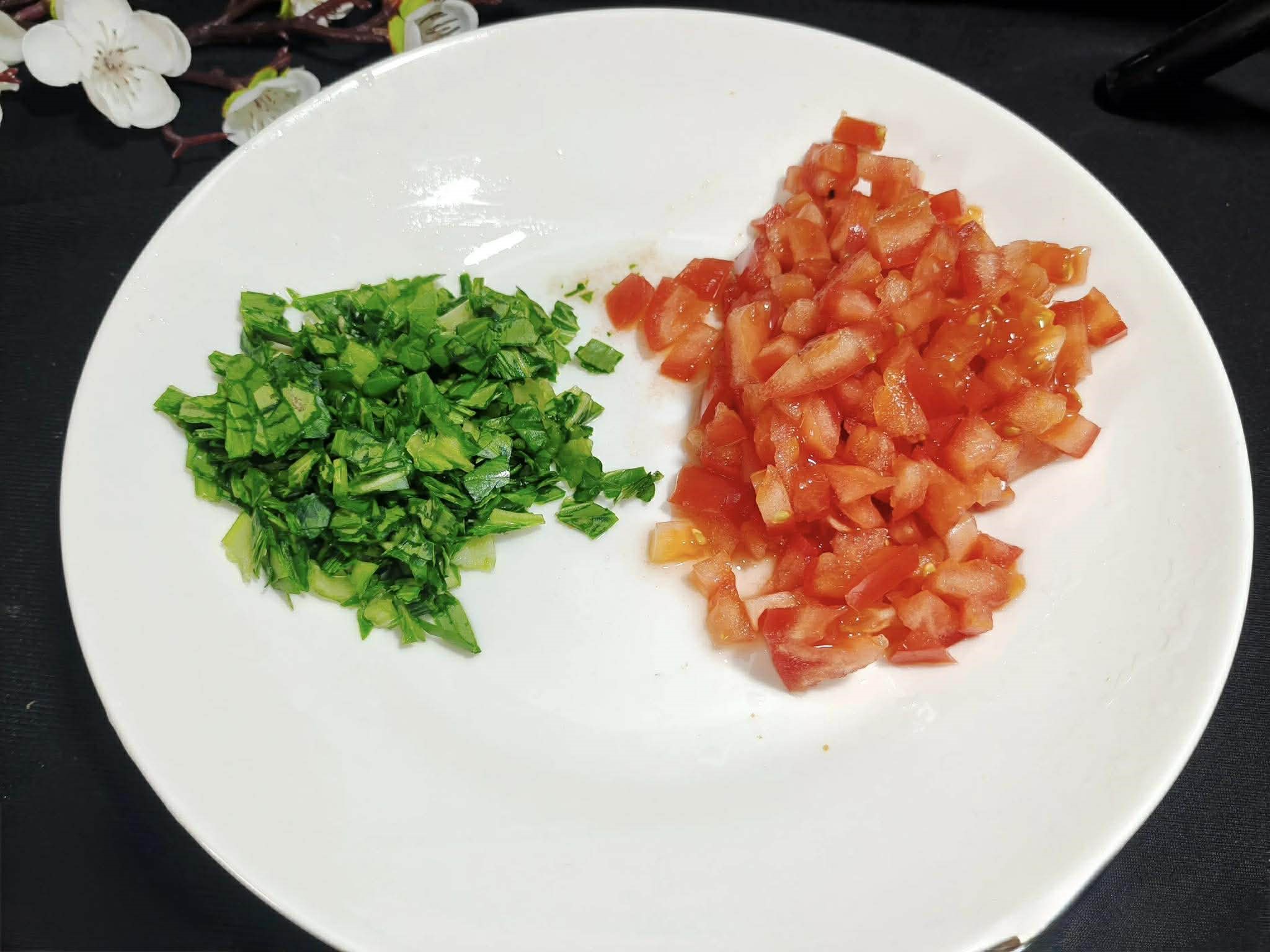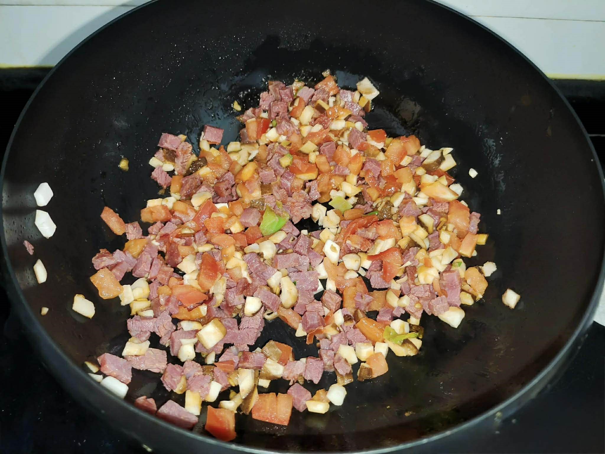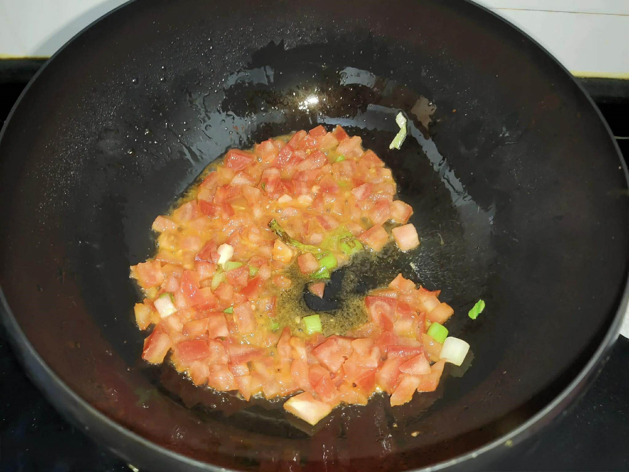 Bước 2: Sau khi chuẩn bị xong tất cả nguyên liệu, bạn có thể bắt đầu nấu. Đầu tiên, đặt chảo lên bếp, đun nóng rồi cho một ít dầu ăn vào. Khi dầu nóng thì thêm hành lá thái nhỏ vào xào đến khi dậy mùi thơm. Tiếp theo, cho cà chua thái hạt lựu vào chảo, xào trên lửa lớn trong một lúc. Sau đó, cho thịt bò và nấm hương vào chảo, đảo đều để làm dậy mùi thơm của các nguyên liệu và khử bớt mùi đất của nấm hương tươi.