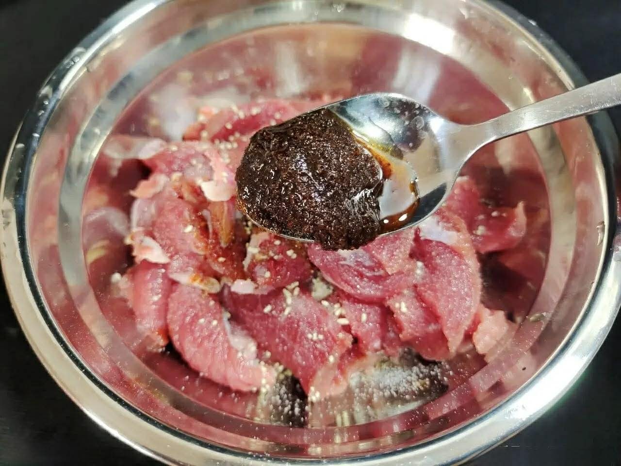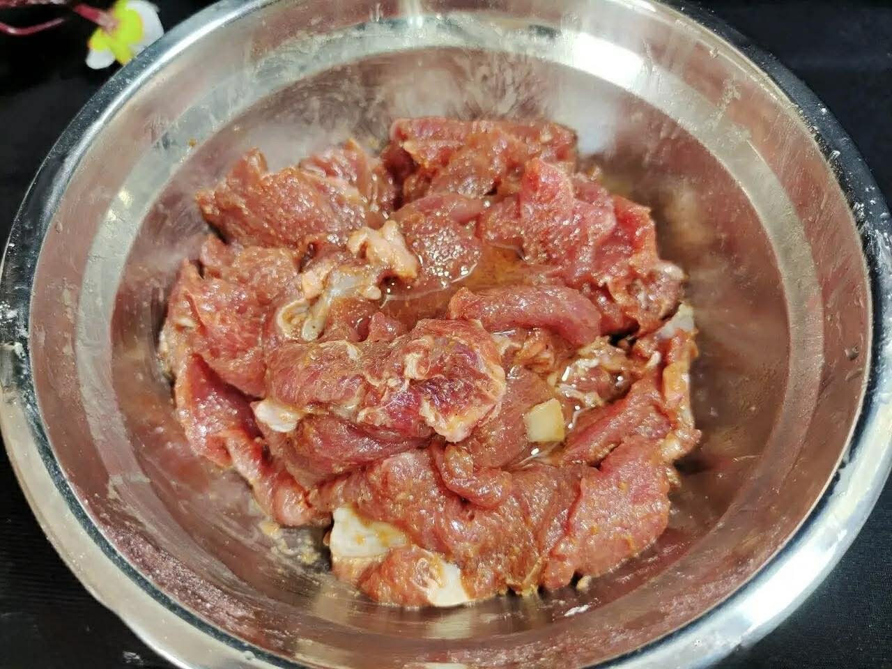 Bước 1: Nguyên liệu chính của món ăn này là thịt bò, nên hãy ướp thịt trước. Thịt thăn bò rửa sạch sau đó thái lát rồi cho vào bát. Rắc chút muối, nước tương, một ít tinh chất cốt gà và 1 thìa canh sốt sa tế, trộn đều. Sau đó thêm một ít bột bắp và trộn lại lần nữa cho hòa quyện. Ướp thịt bò trong khoảng 10 phút. Lưu ý rằng bột bắp bạn nên dùng loại "bột bắp làm mềm", có chứa papain giúp thịt mềm hơn. Loại này thường có bán ở siêu thị. Nấm đùi gà chọn cây to, sau đó rửa sạch rồi thái lát dày. Hành tây bóc bỏ vỏ, rửa sạch rồi thái miếng vừa ăn. Tỏi bóc vỏ sau đó thái miếng. Gừng đem gọt bỏ vỏ rồi thái nhỏ.