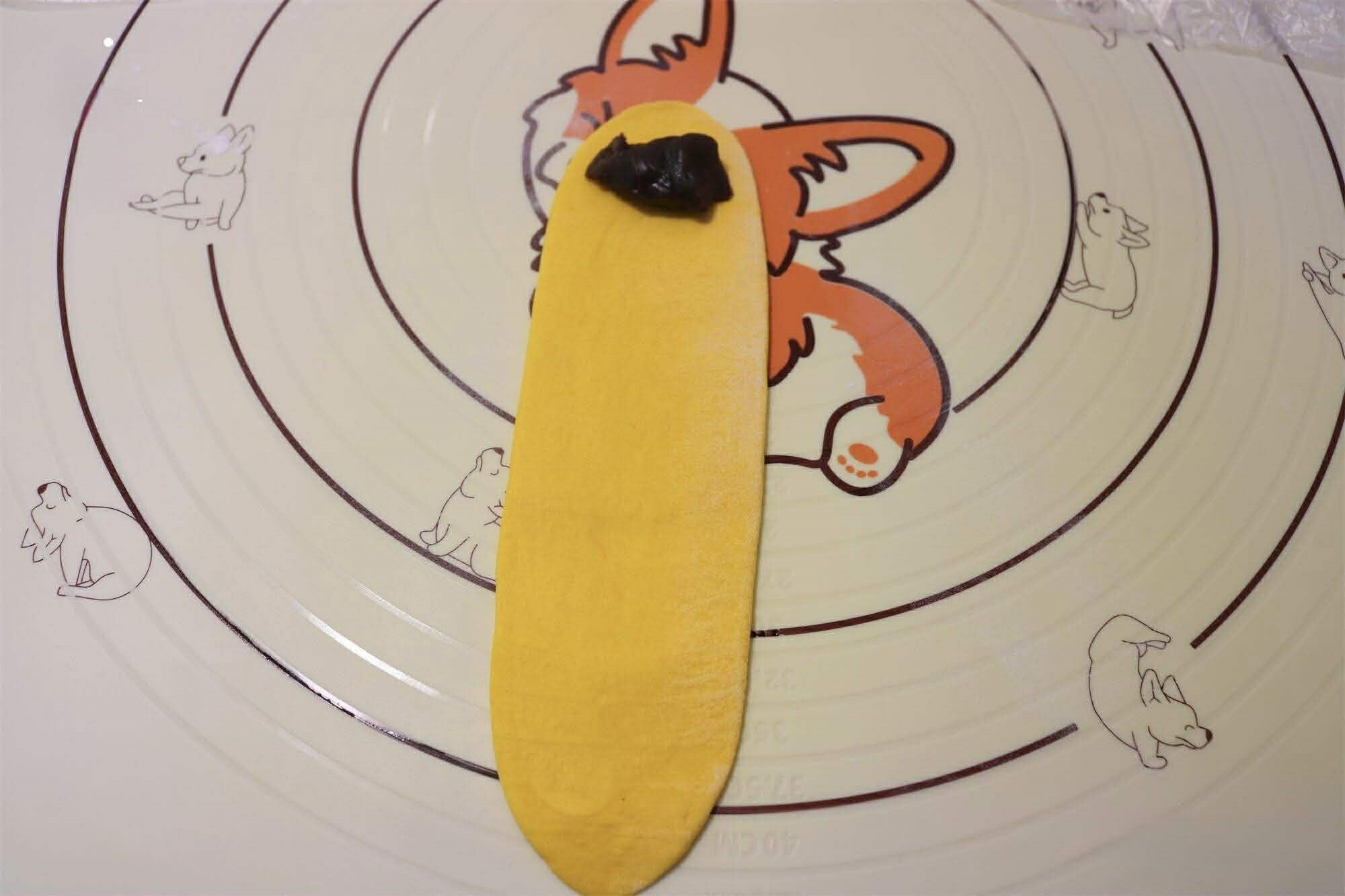Bước 3: Bạn lấy từng phần bột, cán thành dải dài và đặt một ít nhân đậu đỏ ở một đầu. Sau đó cuộn lại từ đầu có nhân đậu đỏ. Khi chỉ còn khoảng 1/3 dải bột, hãy cắt đôi theo chiều dọc. Sau đó tiếp tục cuộn cho đến khi hết toàn bộ.