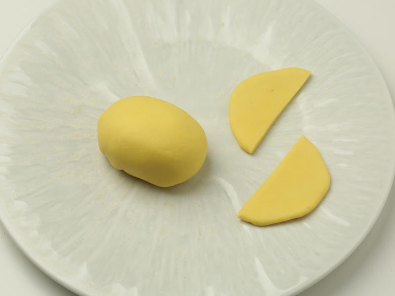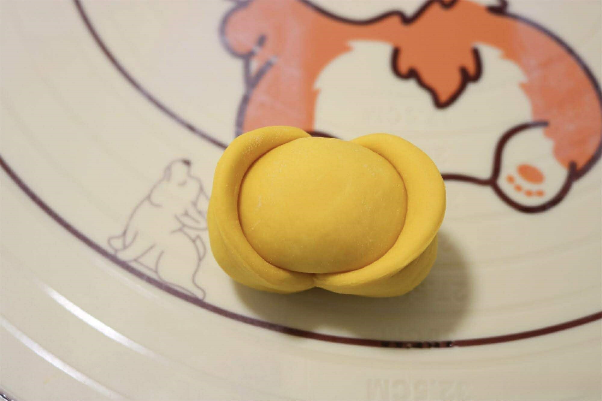 Hoặc bạn cũng có thể tạo hình thỏi vàng theo cách: Chia bột thành các viên 55g; nhân đậu đỏ thành các viên 45g. Để dành 15g từ mỗi viên bột để nặn tai thỏi vàng, phần bột còn lại để gói nhân đậu đỏ. Dùng ngón tay bóp chặt miệng khối bột lại và tạo hình thành hình bầu dục. Lấy một phần bột nhỏ cán thành hình tròn có đường kính khoảng 8 cm, sau đó cắt đôi để làm tai thỏi vàng. Dùng nước để dán hai đầu tai của thỏi vàng lại với nhau, bạn có thể điều chỉnh nhẹ chiều dài và chiều rộng của tai, đảm bảo mối nối chắc chắn.