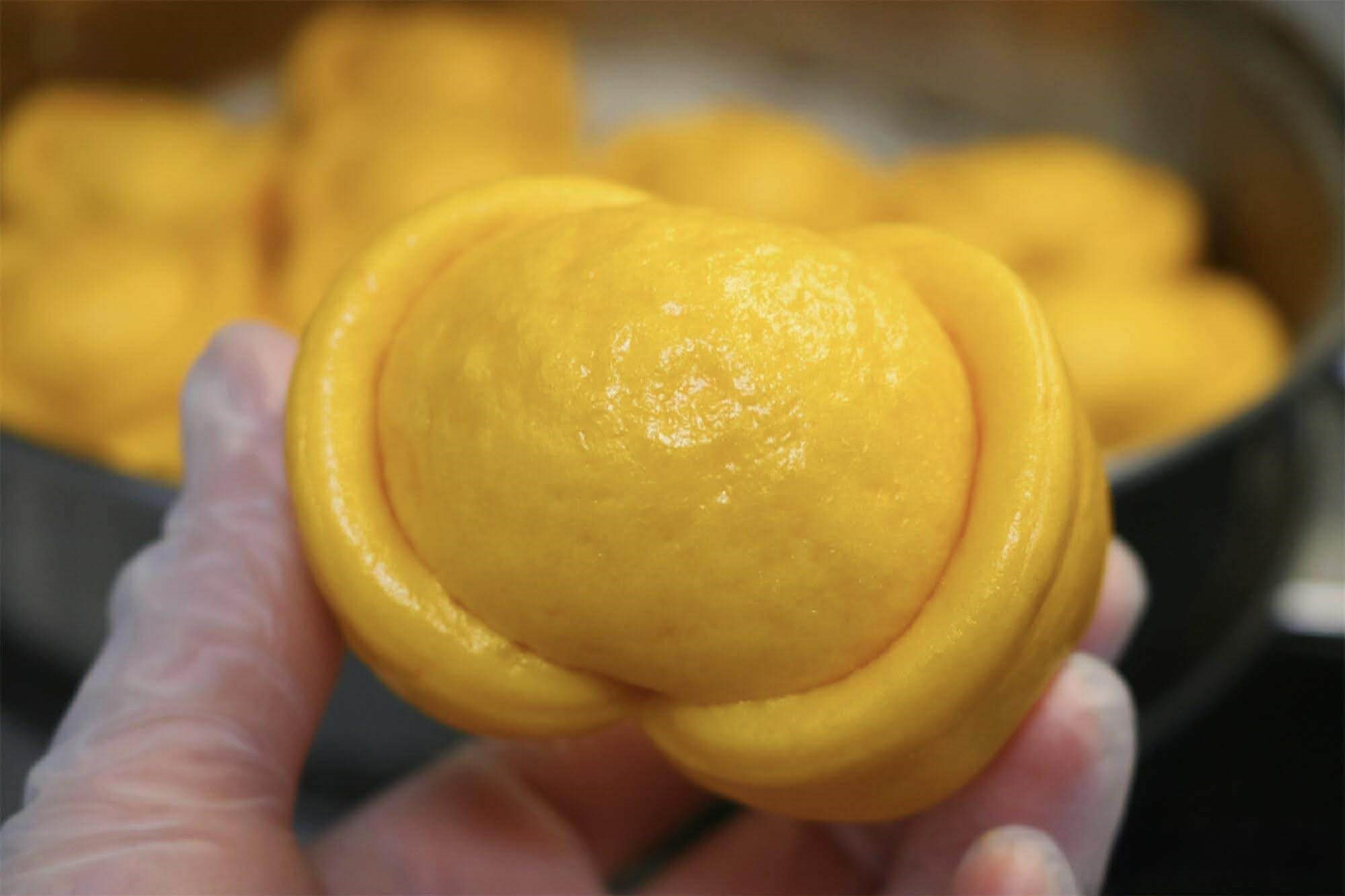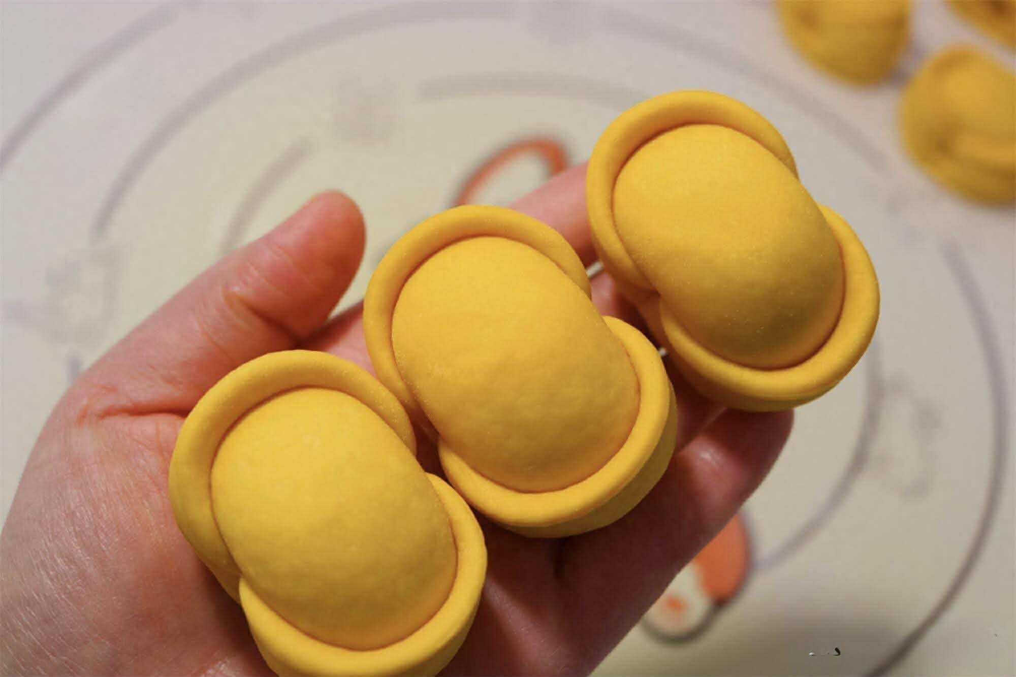 Bước 4: Bóp chặt hai đầu và uốn chúng ra ngoài, đồng thời bóp chặt phần đáy lại với nhau. Uốn cong các cạnh đã cắt ra ngoài để tạo hình thành thỏi vàng. Sử dụng phương pháp tương tự, để hoàn thành hết các nguyên liệu. Sau khi phần bánh bao hình thỏi vàng đã được tạo hình xong, bạn đặt chúng vào xửng có lót giấy nến đã được đục lỗ thủng. Sau đó đậy nắp lại và để bột nở. Khi đã thấy từng chiếc bánh bao nở đáng kể và khi chạm vào thấy nhẹ, chúng đã sẵn sàng để hấp.