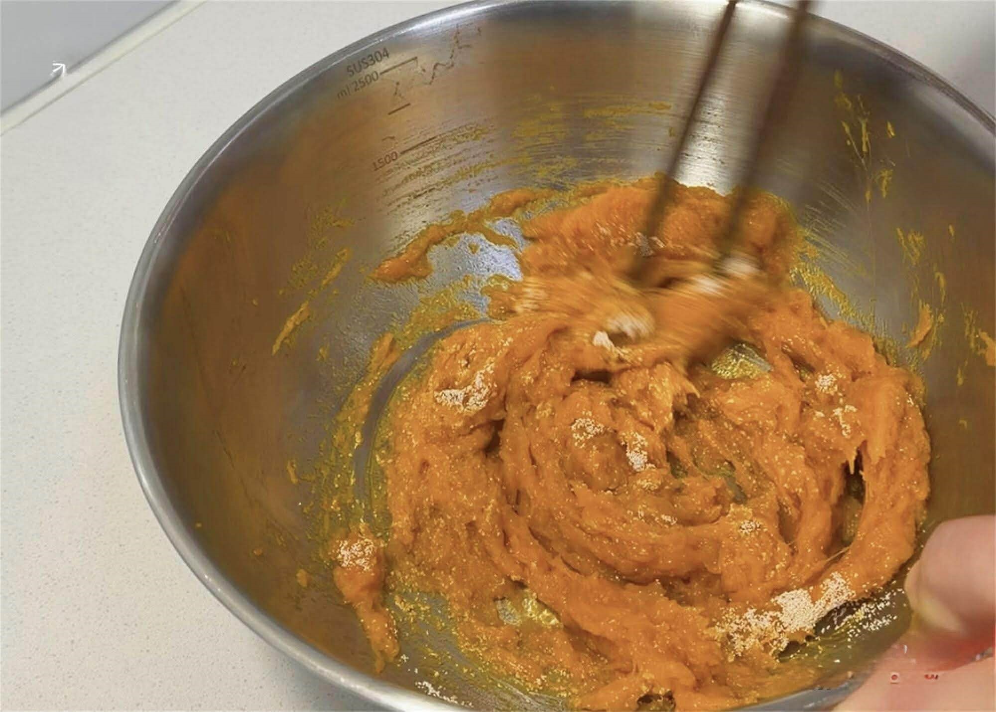 Lưu ý: Mỗi loại bí đỏ sẽ có hàm lượng nước khác nhau. Do đó tùy vào loại bí đỏ bạn sử dụng mà điều chỉnh lượng thích hợp. Chỉ cần khi thêm bí đỏ vào đủ để tạo thành khối bột có độ dẻo vừa phải là được.