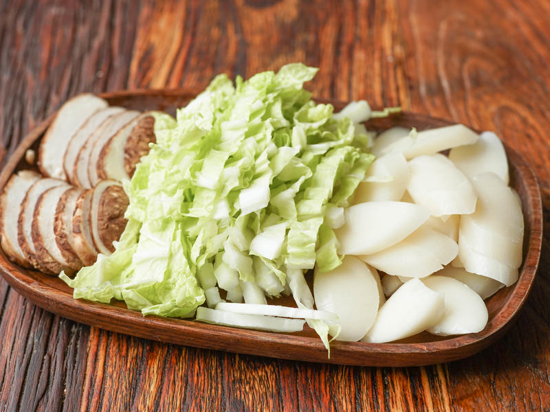 Nguyên liệu: 200g bắp cải, 150g bánh gạo, 2 câu nấm hương, 100g thịt nạc, một chút muối, nước tương, 1 thìa canh rượu nấu ăn, một ít gừng thái sợi, hành lá thái nhỏ, bột bắp, bột tiêu trắng