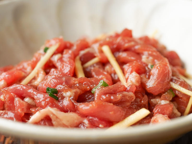 Bước 1: Thịt nạc bạn rửa sạch sau đó ướp với nước tương, gia vị và bột bắp trong khoảng 15 phút. Bún khô rửa sạch, để ráo nước. Thịt viên (hoặc bạn có thể dùng viên cá, viên tôm) đông lạnh cần rã đông trước, thêm nguyên liệu này giúp nước dùng đậm đà, ngon hơn.