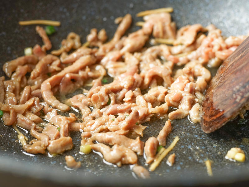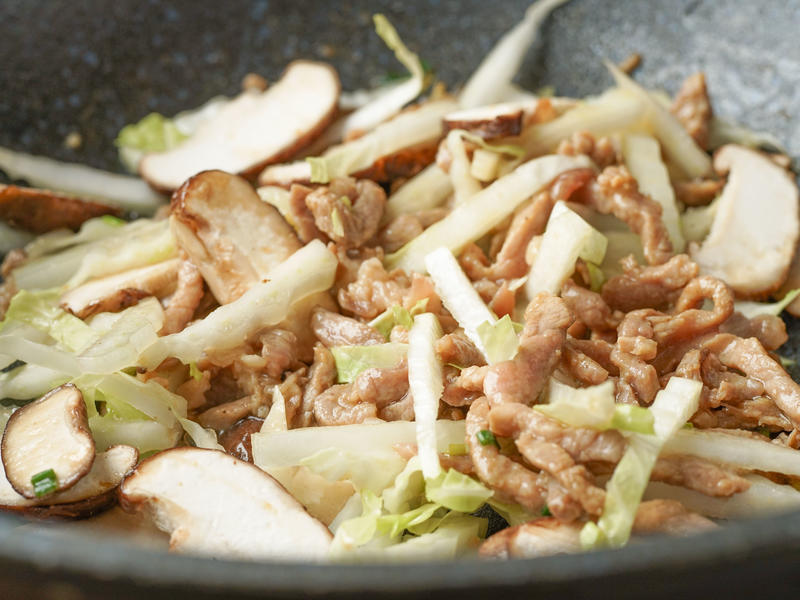 Bước 3: Đặt nồi lên bếp, cho một chút dầu ăn vào rồi đun nóng. Khi dầu nóng, cho thịt đã ướp vào xào nhanh tay đến khi thấy thịt chuyển sang màu trắng. Tiếp đó bạn thêm bắp cải thái nhỏ và nấm hương vào nồi và xào nhanh.