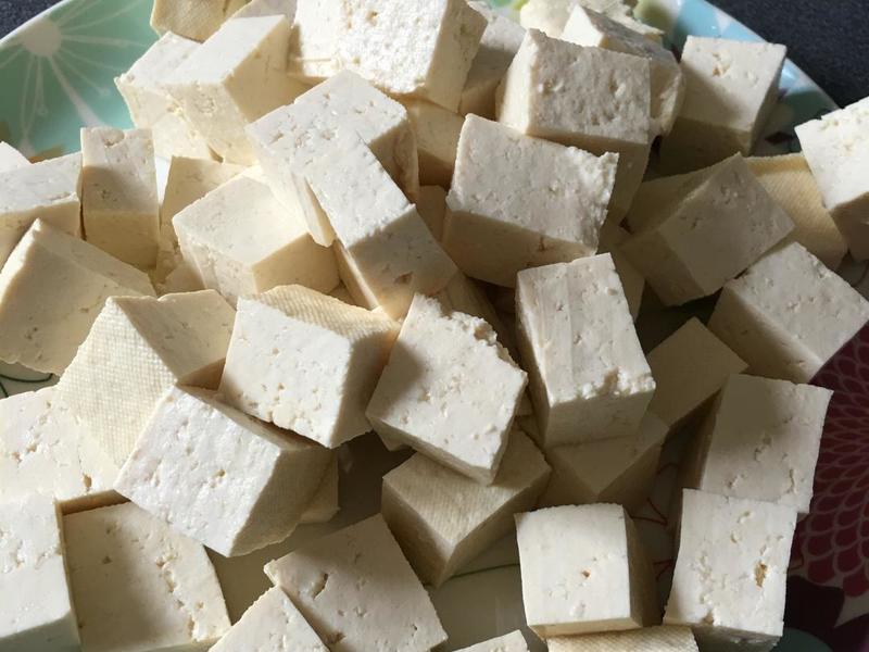 Bước 1: Đậu phụ cắt thành khối vuông nhỏ có kích thước khoảng 2cm. Sau đó lăn qua bột bắp sao cho phủ đều một lớp mỏng.