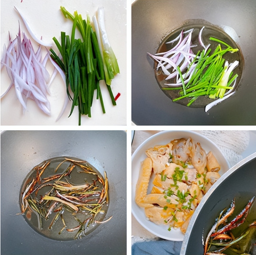 Bước 3: Đun nóng dầu trong chảo ở lửa vừa và phi hành lá cùng hành tây đã thái nhỏ cho đến khi vàng nâu (khoảng 5 phút). Vớt hành lá ra và để lại dầu hành. Chặt gà thành miếng, rưới dầu hành lá lên khắp thịt gà. Sau đó rưới thêm nước sốt đã pha và rắc hành lá thái nhỏ lên trên. Mùi thơm của hành lá quyện với vị ngọt ngon của thịt gà cùng nước sốt đậm đà thật khó cưỡng!